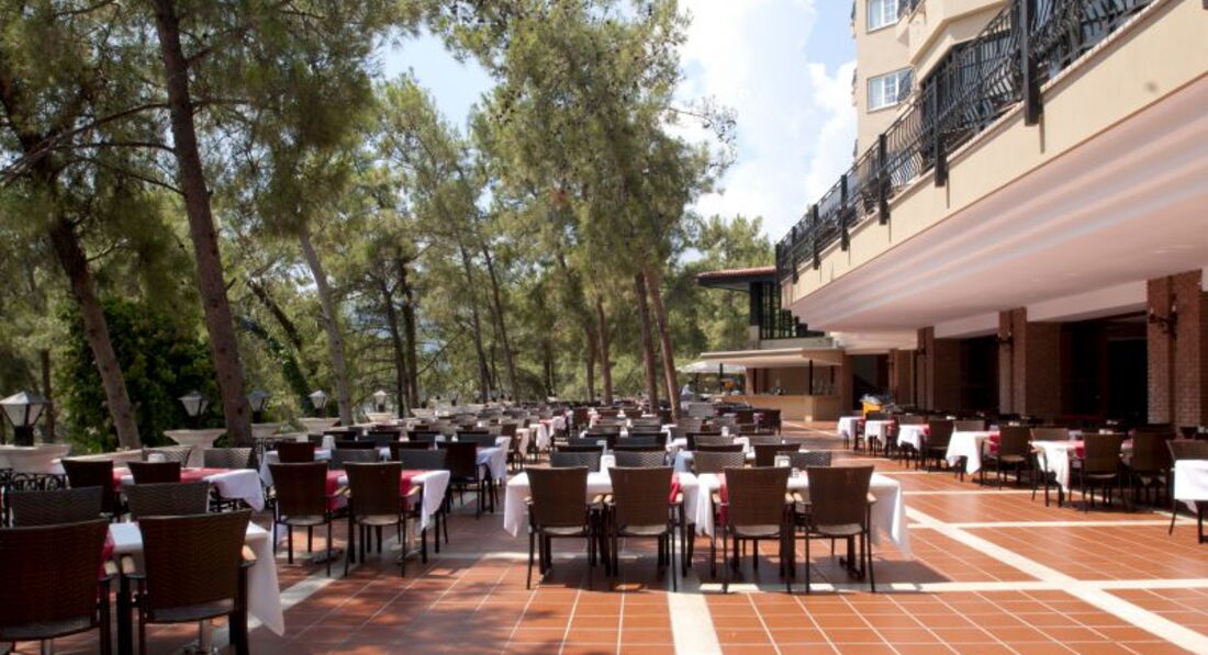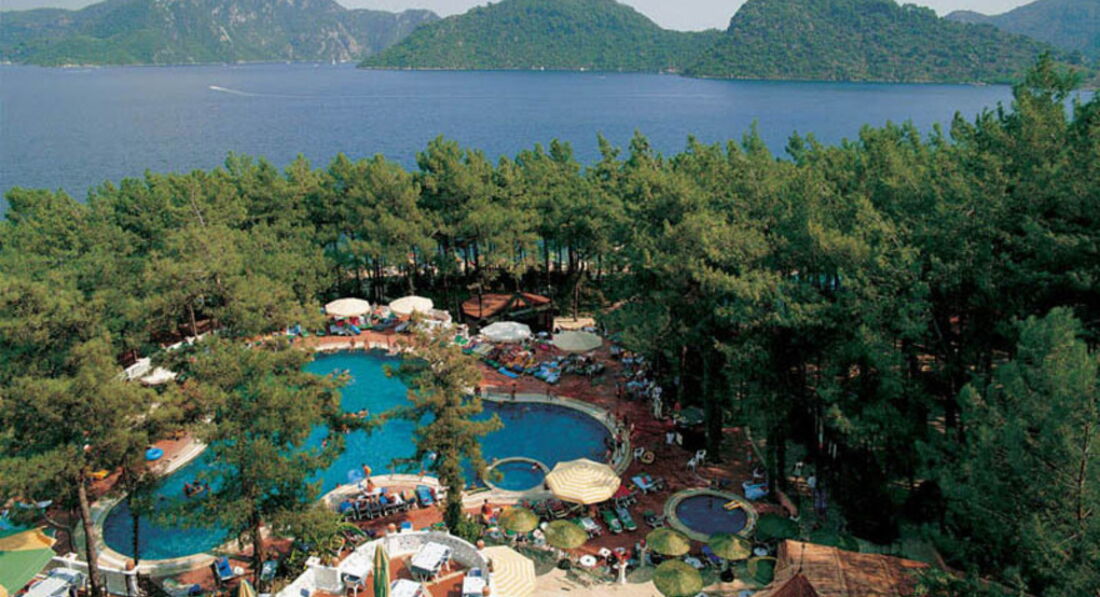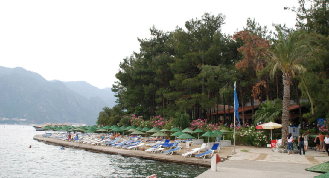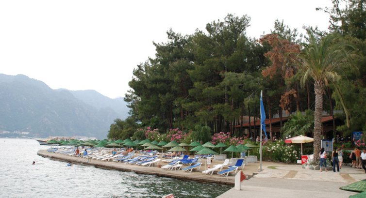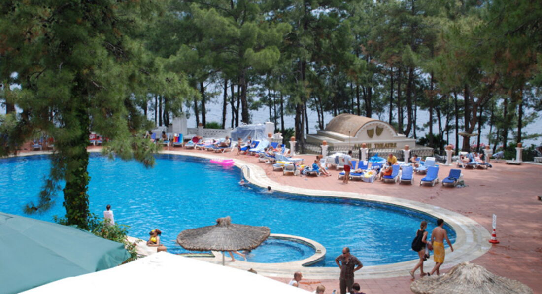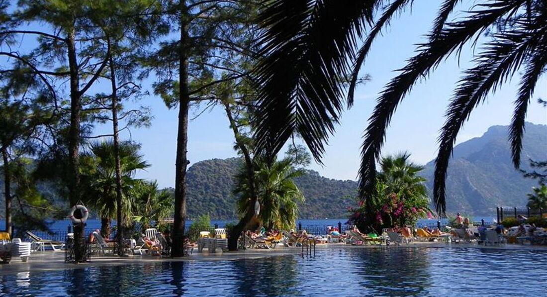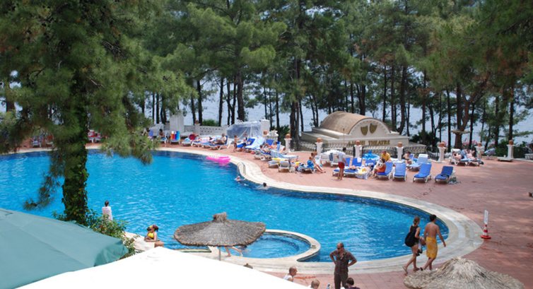 Долго выбирали отель на Мармарисе. Попали на самый разгар бархатного сезона. Этот отель был самый лучший - с большой территорией. Вход в море с платформы - по колено и с пирса - сразу глубоко. Очень красивые виды на живописные холмы. Ресторан крытый и терраса среди сосен...вид на бассейн в вечернее время очень радует глаз. Номера средней площади, ремонт старый. В бунгало окна деревянные, возле балкона растут оливковые деревья. Сервис хороший, персонал внимательный. Еще вернемся! =)