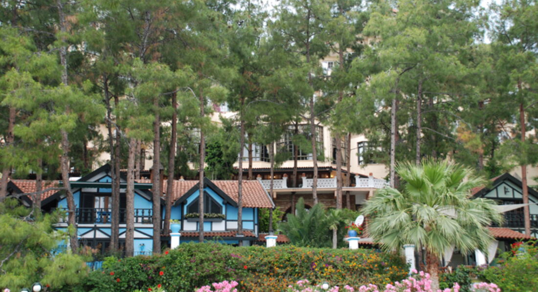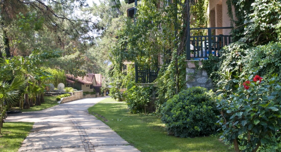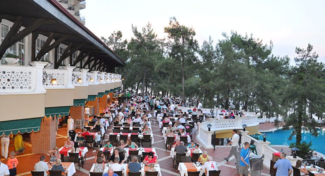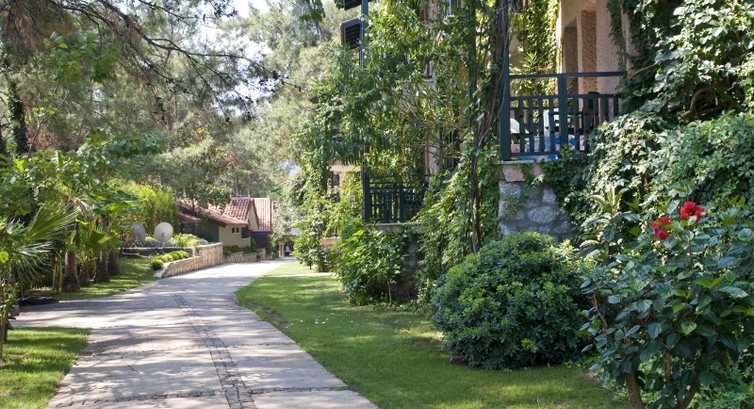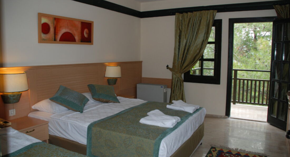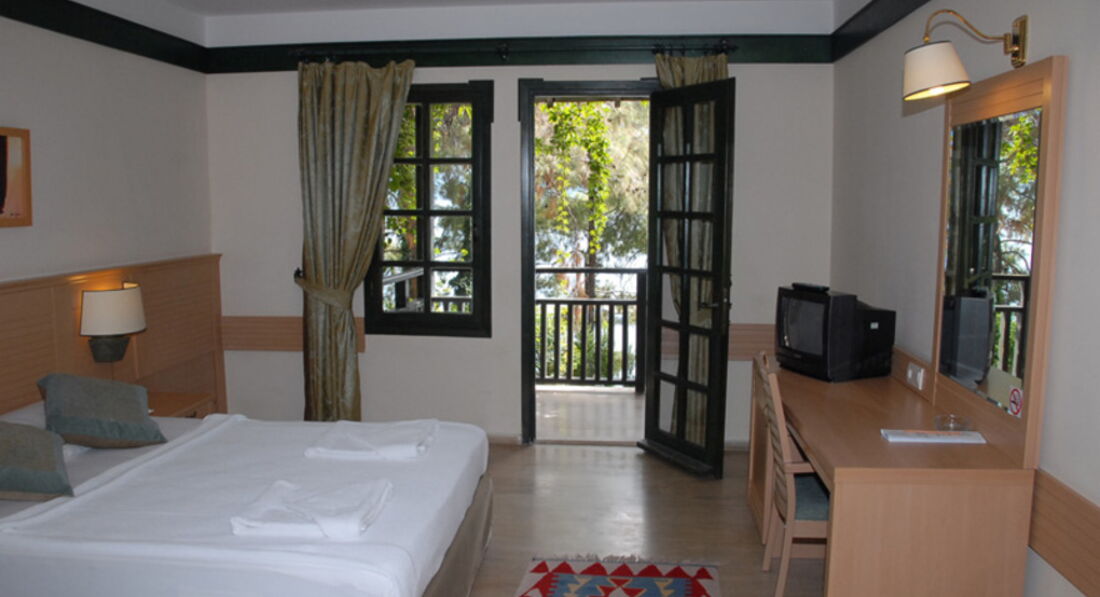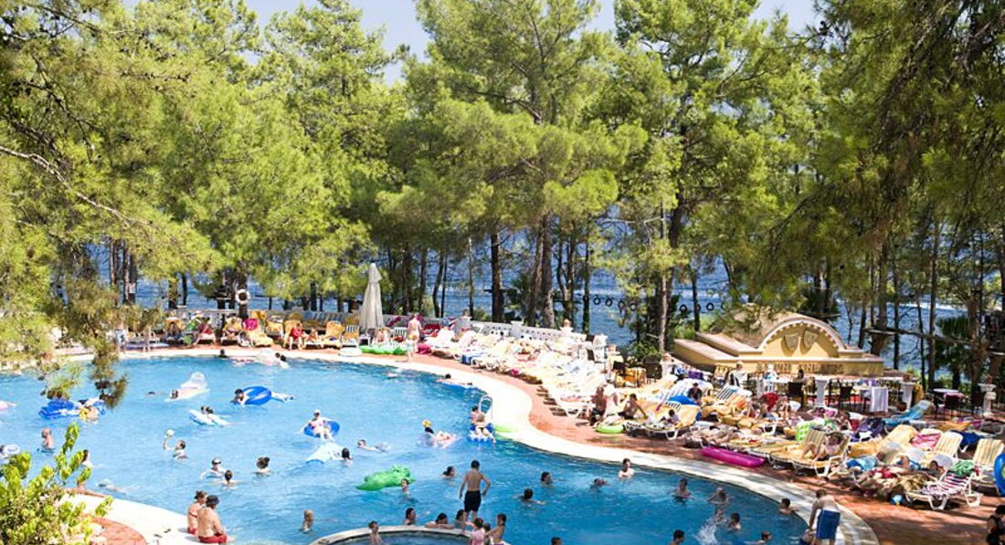 Долго выбирали отель на Мармарисе. Попали на самый разгар бархатного сезона. Этот отель был самый лучший - с большой территорией. Вход в море с платформы - по колено и с пирса - сразу глубоко. Очень красивые виды на живописные холмы. Ресторан крытый и терраса среди сосен...вид на бассейн в вечернее время очень радует глаз. Номера средней площади, ремонт старый. В бунгало окна деревянные, возле балкона растут оливковые деревья. Сервис хороший, персонал внимательный. Еще вернемся! =)