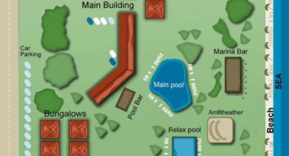 Готель складається з одного 5-ти поверхового головного будинку та двадцяти шести 2-х та 3-х поверхових бунгало.