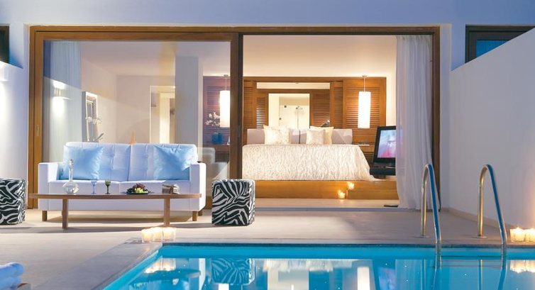 luxury junior suite with private heated pool & gym SV (вид на море, розташовані в саду, на другій лінії від моря, спальня з вітальнею, двоспальне ліжко, доп. – софа, окрема зона для фітнесу, тераса (45,5 м2) , індивідуальний басейн з підігрівом (18 м2), макс. 2+1 чол., 61 м2),