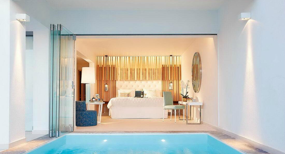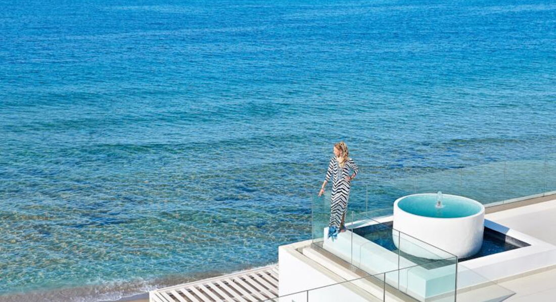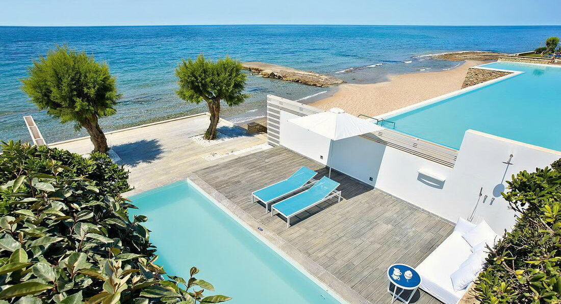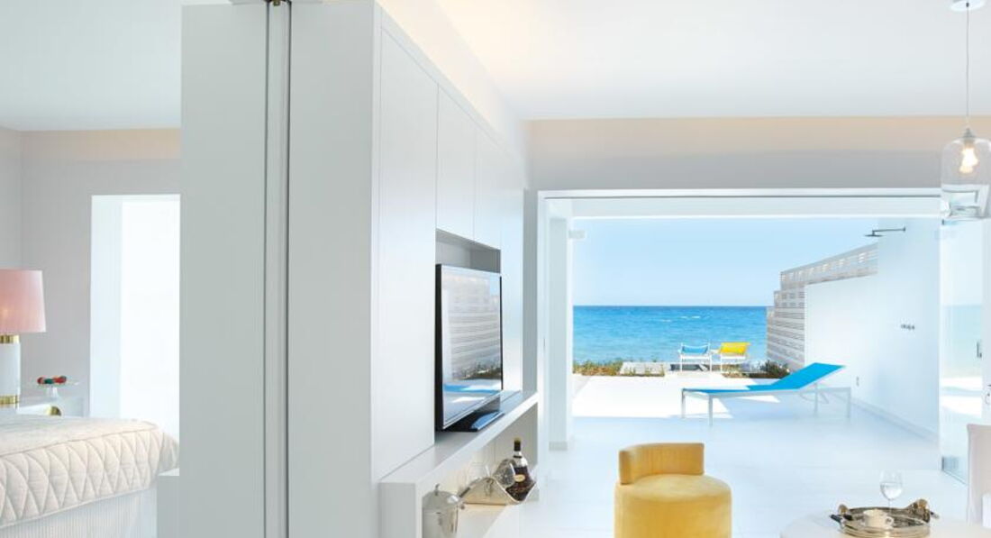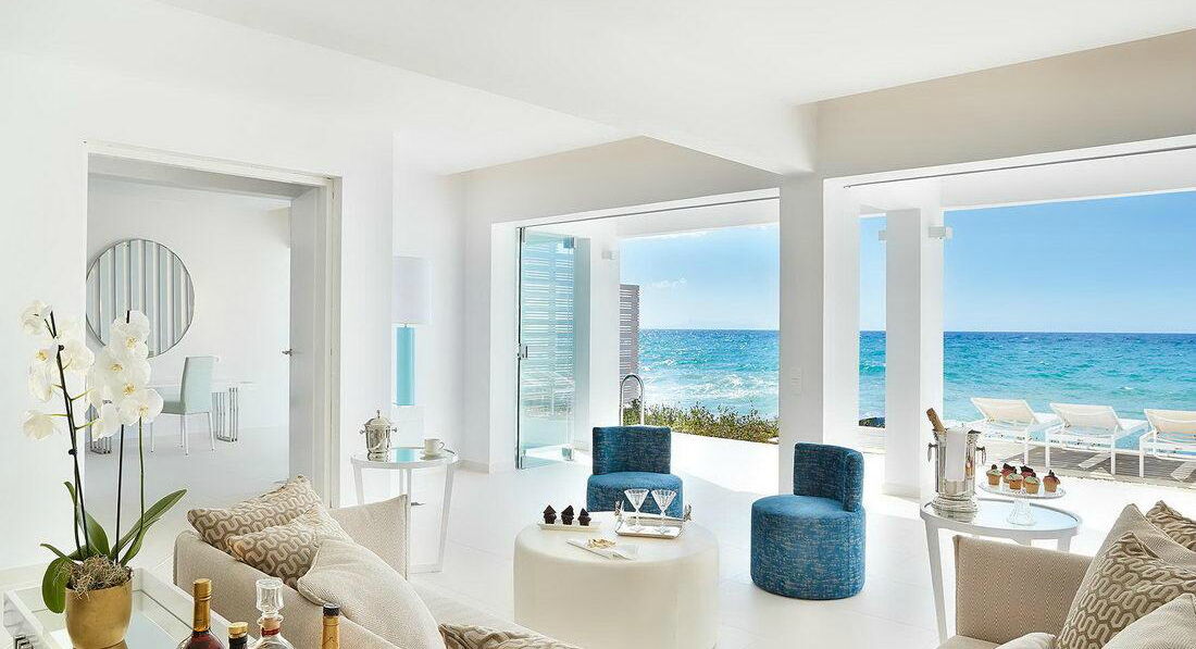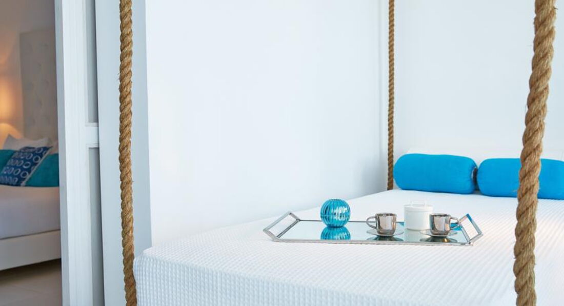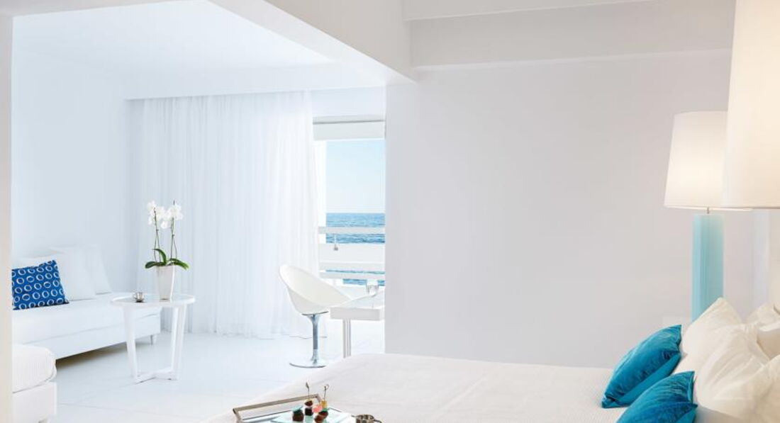 Luxe "Yali" Seafront Suite Sharing Pool (вид на море, розташовані в крилі "Blue", "Rethymno", спальня з ліжком - королівського розміру і вітальня з розсувними дверима - може бути використана як додаткова спальня, вбиральня, вихід до загального басейну, максимум 2+2, 54 м2),