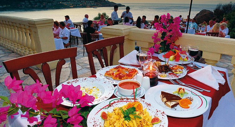 Бари та ресторани: головний ресторан розрахований на 350 осіб (критий, з кондиціонером, літня тераса, дитячі стільці), лобі-бар (10:00-23:00), бар біля басейну (10:00-23:00), бар на пляжі (10:00-18:00), диско-бар (23:00-02:00) та ін. 3 ресторани A la Carte: італійська, турецька, рибна - платно, за попередньою резервацією.