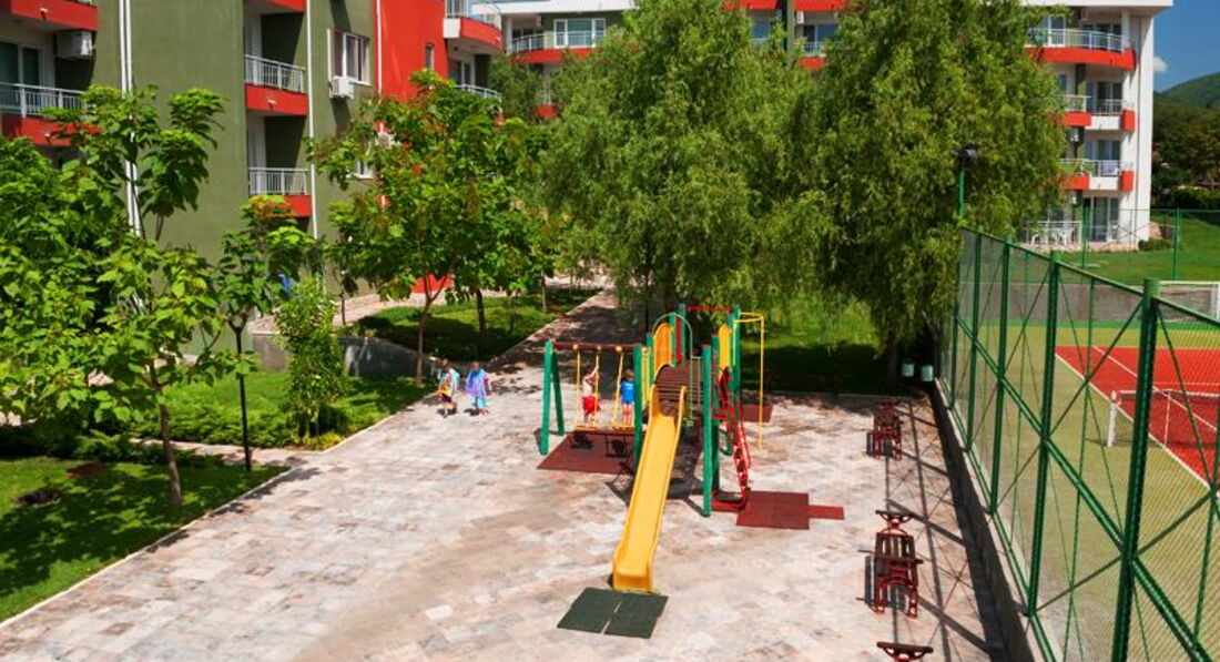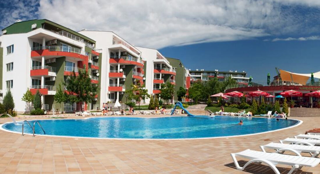 Сейчас находимся на отдыхе в этом апартотеле. Столкнулись с некоторыми трудностями и в отзывы об этом отеле хочу добавить ложку дегтя. Во-первых расположение. Отель находится на второй линии рядом с довольно оживленной четырехполосной дорогой. Прямо перед отелем находится территория бывшего санатория, на которой в данный момент идет оживленная стройка нового гигантского отеля. Отсюда все вытекающие прелести. До ближайшего пляжа минимум 500 метров, чтобы спуститься к морю, нужно преодолеть чудо-мостик из тоненьких досочек с дырками. На море водоросли и под ногами часто встречаются булыжники. Со стороны Святого Власа пляж намного лучше, но идти до него около 2км. Так что ничего хорошего в расположения этого отеля не вижу. Теперь про сам отель. Оказалось, что здесь много собственников. И если вы бронируете апартаменты не лично у компании форт нокс, в которую входит грин форт, то условия могут отличаться от заявленных. Например мы столкнулись с отсутствием бесплатного wi-fi и с уборкой раз в неделю. Номер большой, все необходимое для жизни есть. Однако мебель убогая, в гостевой зоне двухместный диванчик и два крошечных пуфика. Маловато для отдыха четверых людей, на которых рассчитаны данные апартаменты. Белье с пятнами. Душевая кабинка треснутая, свет в ванной очень мрачный. Всего одна светодиодная лампочка в потолке. Стены картонные. Слышимость аховая. На улице около 8 вечера в соседнем отеле врубается музыка и идет веселье, от которого не спасают даже закрытые окна. Цены в местном магазинчике запредельные. Купили здесь ребенку очки за 9,5 лев. В городе такие стоят 5 лев. Бассейн чистый. Лежаков всегда хватает. Местный спасатель дает уроки плавания. Хотела дочку научить. Взяла урок. Парень по-русски почти не говорит. В итоге ребенок сбил дыхание и орал от резких болей в животе. Две детские площадки. Лестница очень крутая. Маленьким трудно залезть, а старшим это уже не надо. Больше сюда не поедем. Хотя отдых в Болгарии нравится.