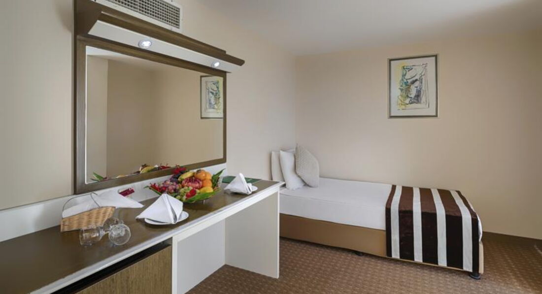 Тут нас ждала первая засада. Так как рейс ночной привезли нас в отель уже к 11:00, а заселение с 14:00... Пришлось ждать (сходили и на завтрак, который немного затянулся и на обед, который с 12:30 и на море, которго долго ждали...и все равно ждали заселения...даже предложенные деньги за раннее заселение не помогли, не было номеров нашей категории. А мы взяли стандарт с видом на территорию ( о чем ни сколько потом не пожалели). В итоге в номер Зашли ровно в 14:00. Номер чисто убран с лебедями и т.п. Но он не новый. Как и весь отель. чистенько но местами пошоркано. Заселили нас в основной корпус на 5 этаж (по нашему 6) над рестораном.( Сразу скажу это вариант на 4, т.к. соседний отель немного шумный по вечерам и с ресторана нет нет да и долетают запахи еды и шум вытяжек нас не сильно напрягало) Короче со стороны ресторана и видом на территорию лучше жить повыше..А в идеале жить с другой стороны над бассейном, там и тише и запахов нет). В номере для ребенка нам вытащили доп. кровать, которая была спрятана внутри основной кровати. Номер стандартный 25м2. Все необходимое было...вплоть до зубных щеток и зубной пасты ( Халаты и полотенца все как должно быть) Минибар с соком и водичкой... пополнялся регулярно). Уборщица молодец почти всегда успевала убрать наш номер до обеда за что ей респект и бакшиш. Сантехника исправно работала...да местами мог бы быть проведён ремонт (перфекционисты привет! Номер 1568 не для Вас!) Всем остальным вполне подойдет.