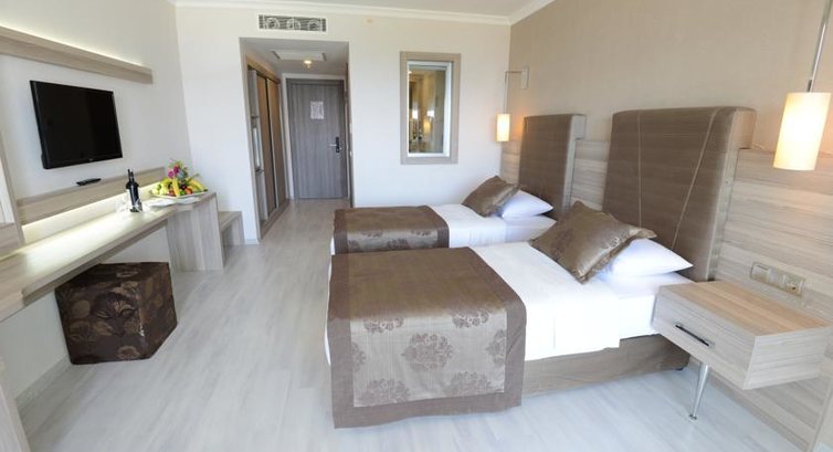 Отдыхали в отеле в августе 2015 года , дорога от аэропорта до отеля заняла около 2х часов, время, в принципе, пролетело незаметно, отель выделяется на фоне остальных в первую очередь размером, отель работал первый сезон, т. к. 2015 года постройки , поэтому сантехника и мебель в хорошем состоянии, что не может не радовать. С заселением особых проблем небыло, приехали раньше расчётного часа на пару часов , нам надели браслеты , отправили кушать, багаж мы оставили на ресепшне , пока осмотрели отель , прошлись до моря , тут и время подошло , заселили в стандарт , без доп. доплат , вид на город, не особо конечно, но , учитывая, что в номере мы только ночевали, нас это не смущало. В номере телек с русским каналом и много музыки ( Российской в том числе) , чайный набор , тапочки , халатов нет , 3 полотенца на каждого гостя , из косметики только жидкое мыло , 2! Ватные палочки и 2! Ватных диска)) для 5* конечно Пипеац))) мини бар входит в all , пополняют Ежедневно при необходимости , собственно это и все , что входит в ультра all, тк ни заявленных фрешей, ни импортного алкоголя там нет , фреши продают за 5 лир в основном ресторане ) но меня не напрягало даже это. Уборка в номере Ежедневно, правда по странному графику , постоянно в разное время, чаевые , которые мы оставляли то на кровати, то на столе НИРАЗУ не взяли , это было большим удивлением , тк у других отдыхающих забирали и меньшие суммы. в целом с персоналом проблема , его категорически не хватает на такое количество отдыхающих , хоть они и очень стараются. Анимация не плохая, ребята стараются , много развлекух придумывают. Питание : много , вкусно, однообразно ))) пахлаву до сих пор вспоминаю ((( море : достаточно прохладное , как мне показалось , ОЧЕНЬ солёное , пляж узкий с достаточно грубым песком , мест днём с огнём не сыщешь , разве если только не дашь Мехмеду 5$ и он будет" бронировать " лежаки всю неделю ;) , мы чаще зависали в бассейне , где также за чаевые нам занимали места, чтобы можно было выспаться ) в целом отличный отдых , особенно хорошей компанией 😉