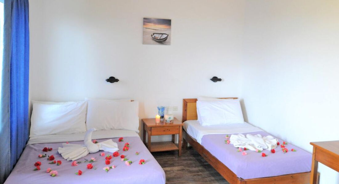 Територія та послуги: • wi-fi на території • автопарковка • трансфер від та до аеропорту • пральня • оренда автомобілів Розваги та спорт: • лаунж-зона з ТБ • сад і тераса • відкритий басейн 160 м2 без підігріву • снек-бар біля басейну (11:00-23:00) • настільні ігри • барбекю • прокат велосипедів • водні види спорту на пляжі Для дітей: • стільці в ресторані (за запитом) • ліжечко в номері (за запитом) Живлення: • BB – сніданок. Пляж: Власний піщаний пляж за 150 м від готелю. Протяжність пляжу – 2 км. Парасольки, матраци та шезлонги – платно. Пляжні рушники не надаються. До оплати приймаються кредитні картки: Visa, MasterCard.