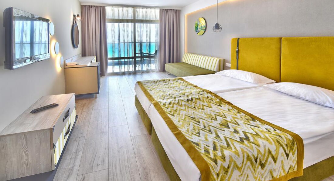 • Family Room Sea View (одна кімната, розділена розсувними скляними дверима на зону спальні з двоспальним ліжком та зону вітальні з двома односпальними ліжками; набір для приготування чаю та кави, макс. 3+1 чол., 35 м2)