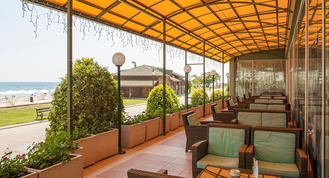 Золотые пески – это курорт, небольшой городок, здесь только отели, кафе и другие заведения для отдыха. Отель находится на первой линии, перед отелем пешеходная улица вдоль берега моря – променад, вечером тут вся жизнь. Очень удобно, что отель находится на окраине курорта, т.е. вечером очень приятно вернуться из шумного центра в тишину.