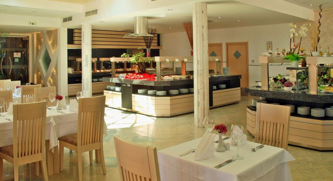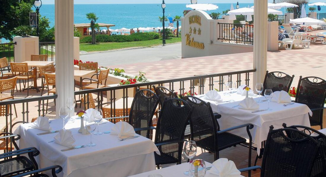 Отель работает по системе "все включено". Питание не слишком разнообразное, но очень вкусное, как дома. На обед было по паре мяса и гарнира на выбор. Были и салатики и супы, маслины, оливки. Из фруктов - персики, яблоки, арбузы, черешня и прочее. Сладкий стол присутствовал, но почему-то все кондитерские изделия были не очень вкусными - наверное покупные, не своего производства. Шеф-повара туристы иногда просили выйти в зал и рассказать рецепт того или иного блюда - это о многом говорит. Раз в неделю организуется национальный стол - украшается ресторан и предлагаются фирменные блюда болгарской кухни. В течении дня на терассе второго этажа доступны газированные напитки из автомата и пиво. Есть полдник с кофе-чаем и печеньями там-же, на терассе.
