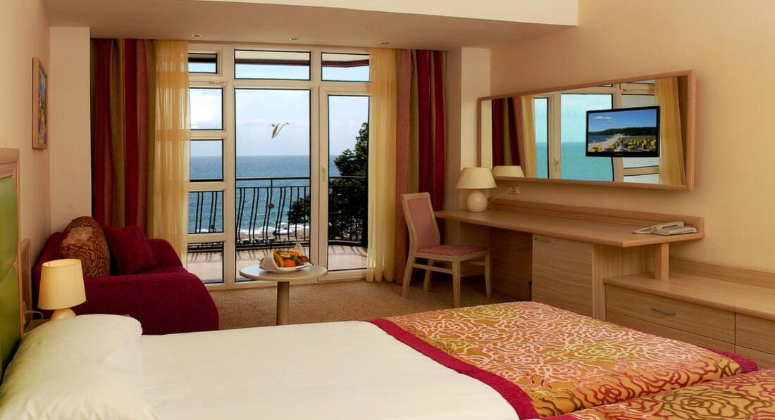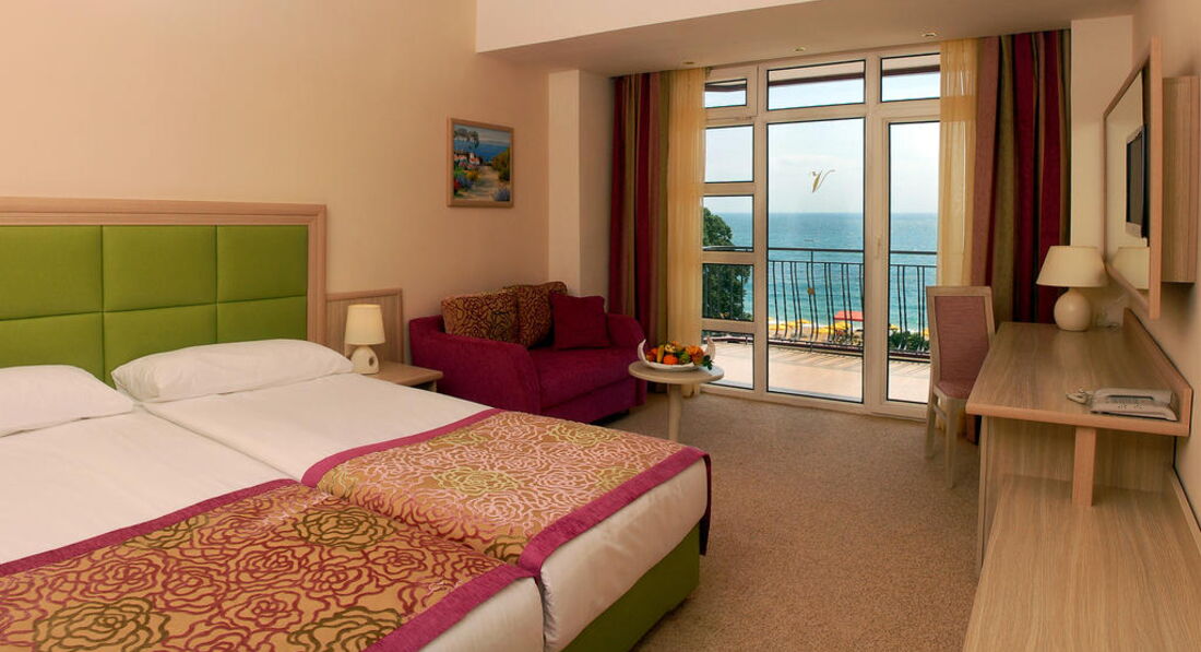 Недостатков немного, рекомендую брать только обеды, от завтраков одних и тех же через неделю желудок протестует, очень осторожно выбирайте блюда, не мешайте продукты несовместимые друг с другом и не берите в тарелку вагон еды. Если видите что мясо или рыба не готовы - то лучше не берите - на песках бактериальная инфекция, сами отравились как и многие в отеле, нет будьте жадными не бросайтесь на шведский стол и все в порядке будет. Из окон вид на теплое красивое море и главную прогулочную улицу курорта. Отель конечно не самый лучший но надо соизмерять цену и качество. Подведя итог, скажу что, в этот отель можно ехать но один раз. Болгария очень красивая страна. В целом вам понравится, не надо требовать от нее супер сервиса, тогда вам в Европу по другим ценам, и если вы терпимы к румынам то останетесь вполне довольны. Хорошего отдыха!
