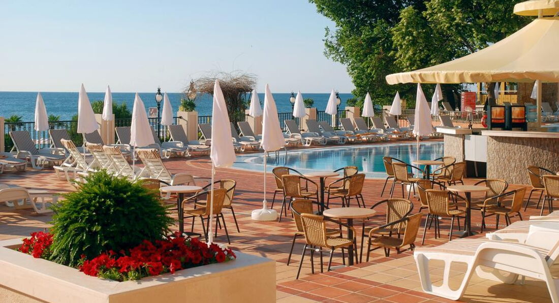 Отдыхали во второй половине августа 2009г, море практически каждый день было волнительное. Комната на 4* не тянет, это 3*, мебель очень уж старенькая и обшарпанная, есть холодильник, на нашем балконе очень много места занимл качающийся диванчик (даже не знаю как его назвать) с не очень чистым покрытием. Ванная после недавнего ремонта с нормальной сантехникой, небольшой прощади. Уборка: оставляли по 1ол. полотенца меняли каждый день, номер убирался поверхностно. У нас вид был на море, до 23.00 трудно было заснуть с открытым балконом, т.к до этого времени в кафешках на набережной играла музыка. А по другую сторону на крыше здания располагались какие-то постоянно гудящие устройства, насколько они были слышны в номерах не знаю, причём это характерно для многих отелей на Золотых песках. Пляж платный~13 евро ежедневно за тент, 2 шезлонга и 2 матраса. Питание менее разнообразное, чем в Турции или Египте, но более подходящее нам по вкусовым качествам, практически всегда были блюда из свинины, вкусные свежие пирожные, из фруктов были яблоки (вкусные), нектарин, спелые и сладкие арбузы, изредка дыня.к. "Всё включено" в этом отеле тоже отличается от Турции и Египта, спиртные напитки были только в обед и ужин. В течение дня можно было попить прохладительные напитки и пиво, бар у бассейна платный. В этом отеле большую часть составляли русские, немного было немцев, а вообще на курорте , былоj большинство иностранцев немцев, поляков, венгров (шумная нация).