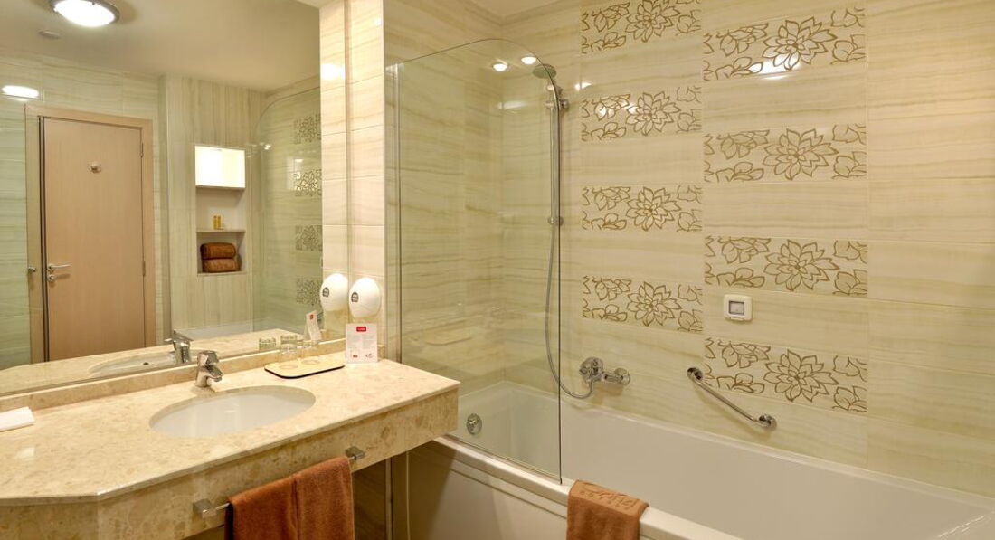 Номера все новенькие,чистенькие.У нас стояла полноценная ванна.Убирали хорошо,претензий не имеем.Качели на балконе отдельный разговор,ребенок в восторге,да и родители тоже были непрочь выйти на балкон и покачатья,а то и позагарать.Балкон у нас был большой,можно было танцевать.Но хочу предупредить,что в больших номерах,семейных или как они там называются,балконы маленькие и нет качелей!Имейте в виду!У нас был вид на парк,это было значительно дешевле,и абсолютно не принципиально.Мы не пожалели ни разу,а даже наоборот.Вид получается часть на деревья,часть на отель Болеро,но самое главное что у нас не пекло солнце целый день,и мы не маялись от жары,а в 16.30.солнышко переходило на нашу сторону со стороны басейна(после чего возле басейна находится прохладно),мы поднимались в свой номер и загорали на своей качели.