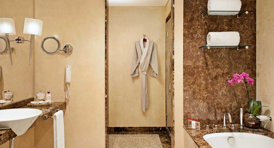 Отель поражает красотой с самого холла - множество живых цветов, все в мраморе, ароматы парфюма. Поселили на 11 этаж.Номер немаленький, кровать невероятно удобная, огромный санузел,где была и ванная, и душ. Шампунь,гель и мыло Булгари.