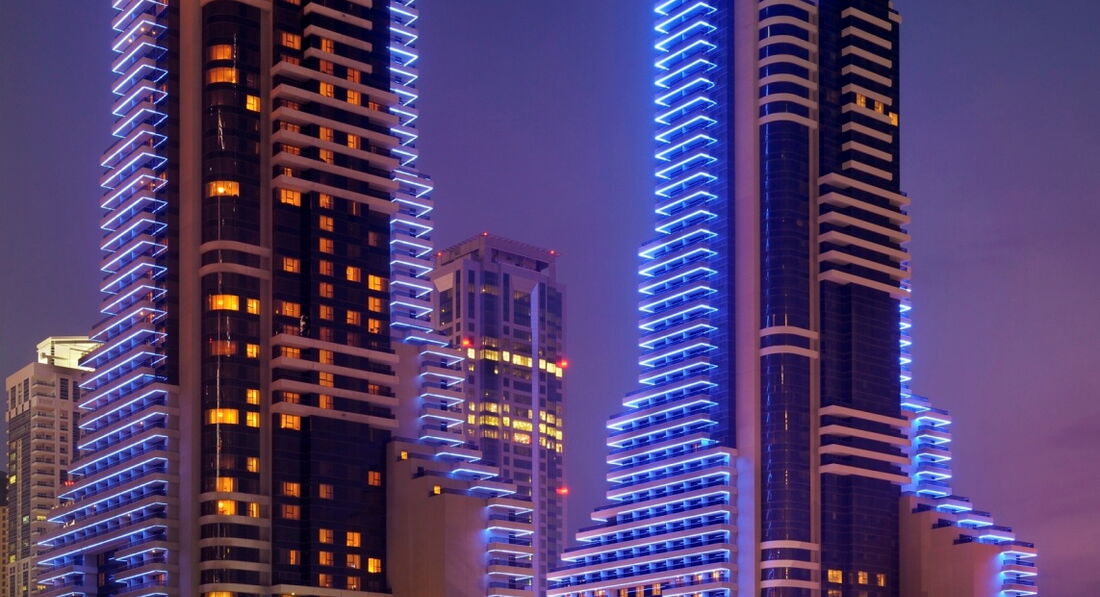 Первое впечатление. Две башни-небоскрёба 40 этажей в современном динамичном стиле с эффектной ночной подсветкой. Через трассу от променада Джумейра Бич Резиденс, прямо на набережной прогулочной зоны Марины. В лобби эскалатор. Сверкающий интерьер, кристаллы, живые орхидеи, просторная зона ожидания.