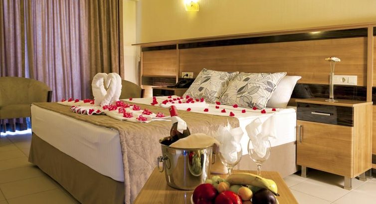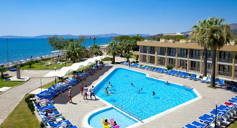 Так как на русском мало отзывов, постараюсь подробно все изложить. Отель новый, чистый, красивый.Несколько корпусов. Мы жили в А. Просторный номер, ванна, туалет, лоджия. Есть сейф (бесплатный), холодильник ( с бесплатнной водичкой, запасы которой постоянно обновлялись). Телевизор с русскими каналами, кондиционер. Короче, все блага. Убирают номер ежедневно. Чаевые приветствуются, но на качестве уборки не отражаются. Территория очень зеленая и красивая. Персонал трудится, как пчелки. Есть бассейны, водные горки, детский городок, тренажерный зал, детская комната. До пляжа рукой подать, море прохладное и прозрачное. Обычно после обеда волны. Полотенцы выдают бесплатно на рецепшене (каждый день). Питание: всё включено,но однобразно. Однако голодным не будешь. Много тушеных, жареных овощей, баранина, курица, рыба, постонно что-то жарят на барбеккю, разные гарниры, сладости обалденные, фрукты. Спиртнное: водка, джин, вино, пиво. Кофе, чай в автоматах. Есть ресторан, и 3 бара. Все они работают по графику. Персонал вежливый, дружелюбный. В основном все говорят на английском. Есть Wi-fi (бесплатный). На рецепшене надо брать периодически пароль. Рядом с отелем рынок. Все в основном в евро, но мы предлагали эту же сумму в долларах. Торгуются охотно. Много экскурсий. Но нам больше всего понравилась поездка в зоопарк, который находится в Измире. Он по размерам второй в Европе. Очень много разных животных, террариум. Впечатлений масса. Вот эта поездка стоит оплаченных денег. А вообще, время прошло незаметно. Отдых удался. Только положительные эмоции, тем более нам есть с чем сравнивать.