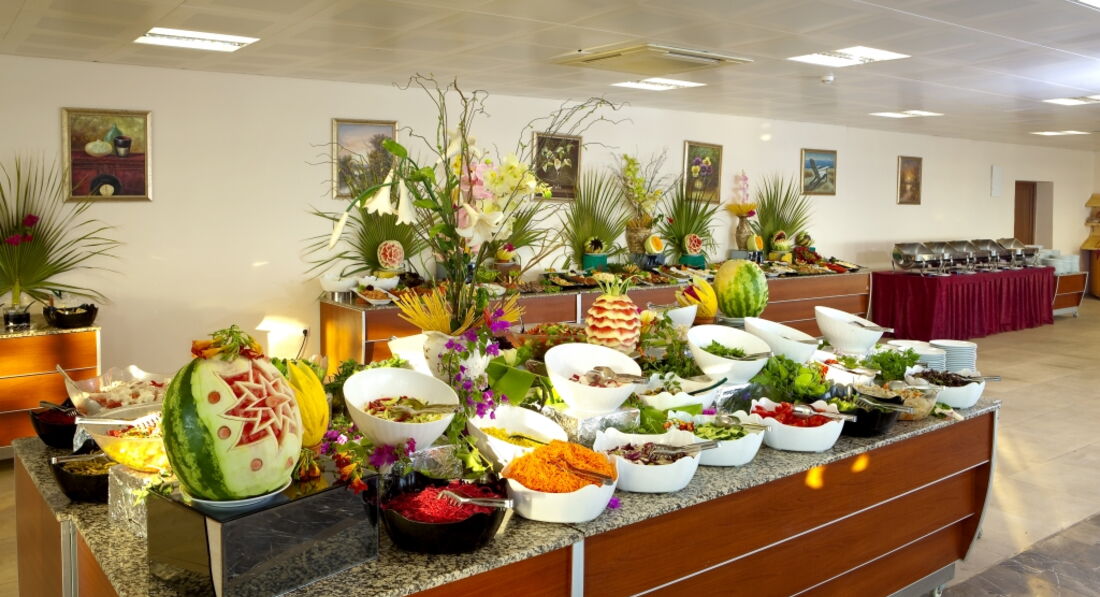 На территории отеля есть ресторан и несколько баров. Питание отличное, разнообразное, даже не успели всё попробовать за 10 дней отдыха. Выбор блюд огромный: вкусные супы-пюре, куриное мясо, баранина, рыба, свежие овощи, тушеные овощи, вкусные баклажаны, маленькие булочки с фисташками, вишня и персики в собственном соку,фрукты (арбузы, дыни, яблоки, нектарины, виноград, сливы) и многое-многое другое. Отдельной похвалы заслуживают десерты.Они очень вкусные и красиво оформленные.Чай и кофе из автоматов.Из спиртных напитков - пиво (вкусное), водка, белое и красное вино.Везде стоят автоматы с холодной питьевой водой и напитками.
