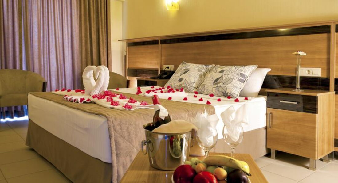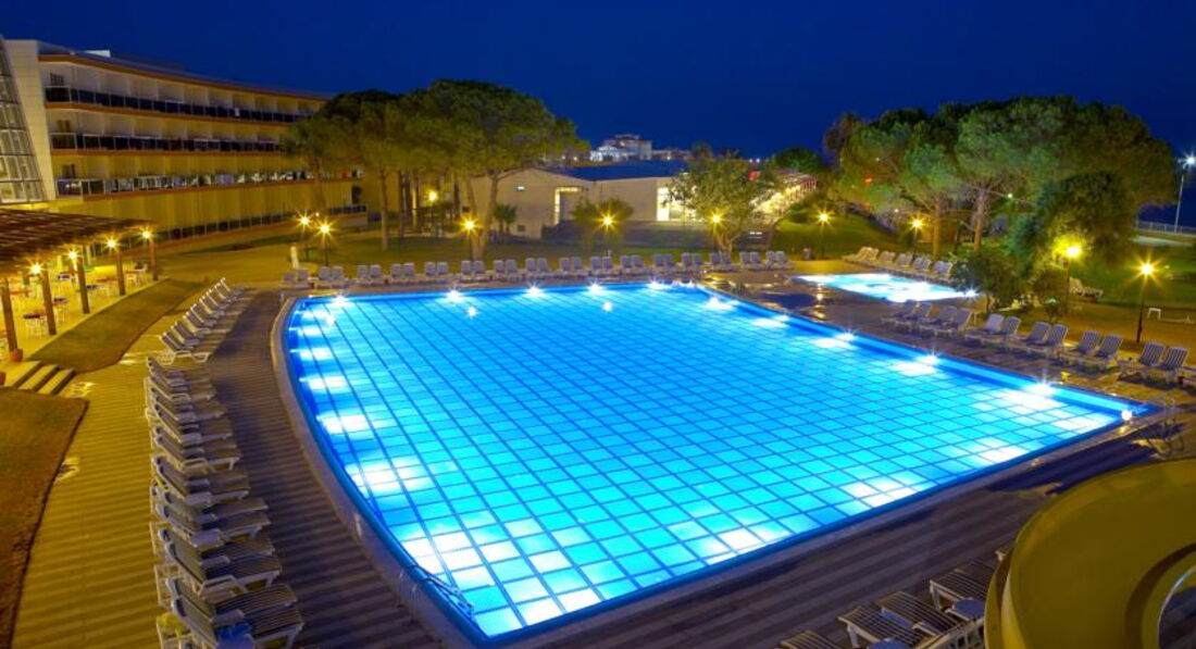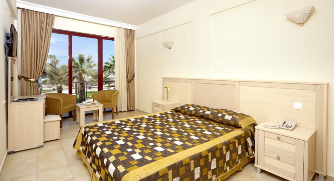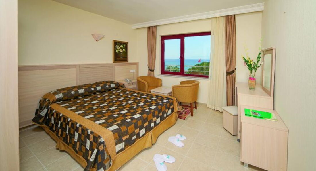 В отеле 4 корпуса, самый современный - это 4-этажный корпус А, номера которого в основном выходят на большой бассейн и на море. Номера стандартные: двуспальная и односпальная кровати, два кресла, журнальный столик. все очень компактно, но не тесно. Звукоизоляция, конечно, оставляет желать лучшего. Слышно все, что происходит в коридоре, в соседних номерах и в санузле. Кондиционер центральный, практически бесшумный. В номере есть бесплатный сейф. Основной минус этого корпуса - близость амфитеатра и шумная анимация у бассейна. Если вы не любители громкой музыки, селитесь в другие корпуса. Корпус В - это семейные номера, а корпуса С и D - это тихая зона, там номера менее комфортабельные, рассчитаны в основном на 2 человек. На территории 3 бассейна, самые популярные - большой бассейн и бассейн с горками. Вода очень чистая и теплая, просто блаженство. Есть лягушатник для малышей. Анимация средненькая, днем в большом бассейне играют в водное поло. Питание в ресторане очень хорошее, большой выбор фруктов, выпечки, из мяса в основном курица и индейка. На гарнир рис, тушеные овощи, разнообразные салаты. Персонал в ресторане очень внимательный, обслуживание на высшем уровне.