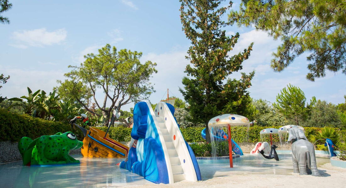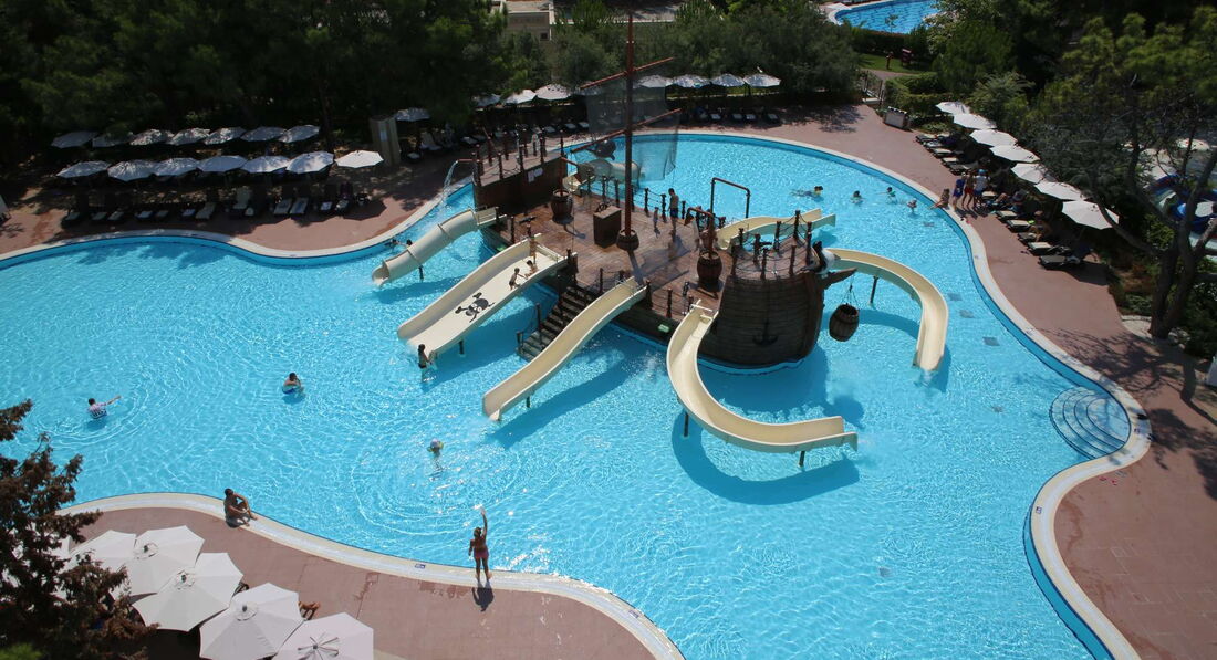 аквапарк - просторный с большим количеством лежаков, разные зоны как для детей небольшого возраста так и для взрослых.. горок много и разных в аквапарке присутствует бар столики в котором постоянно пахнет хвоей столики стоят между сосен и это спасает от зноя.. персонал, аниматоры работают на отлично, но после прошлого сезона не все хорошо говорят по русски.., думаю подтянуться к разгару). главное стараются все..