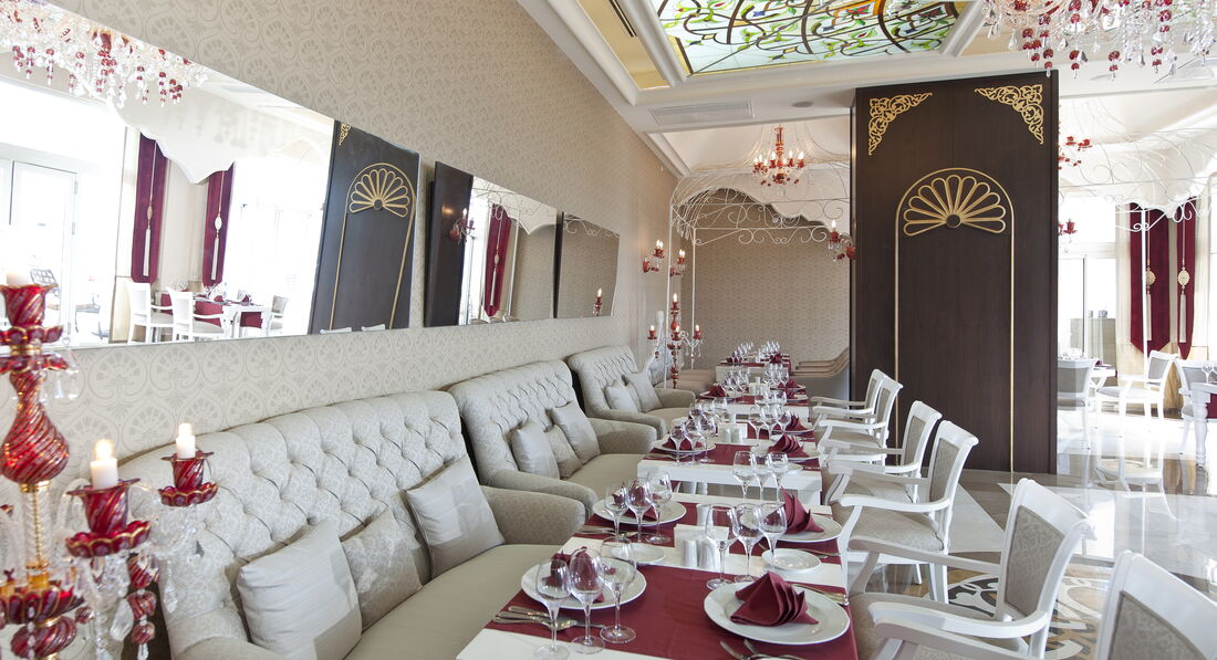 Ресторан и питание- наверное поразило больше всего- мегаразнообразие на 5+. Есть все на любой вкус. Из делюксового набора: раки(через день), королевские креветки(пару раз), сыры типа дорблю и филадельфии каждый день,перепела, утка по-пекински, из десертов фондю - клубника и бананы в черном и белом шоколаде, алкоголь импортный натуральный. Остальное- любые фрукты и овощи, супы,каши(гречка,манная), рыба - дорадо,форель, много гриля, пельмени,суши,разнообразие закусок и море десертов, мороженое. Всего не перечислить. Ресторан красивый, скатерти меняют после каждого посетителя- целиком- всегда идеально чистые. Официанты разные- есть очень вышколенные, есть вообще новички и неприятные (соотношение 80/20). Из хороших официантов запомнили Cem, Melika. Главный повар всегда находился в зале-смотрел что выбирают гости- и приветливо улыбался.