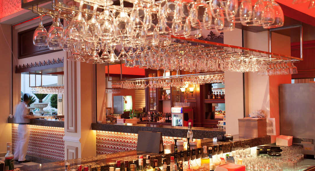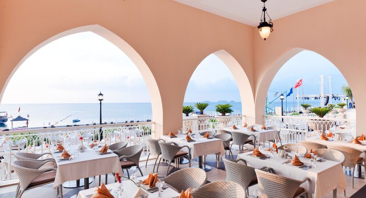 Бари та ресторани: головний ресторан розрахований на 800 осіб (критий, з кондиціонером, літня тераса, дитяче меню, дієтичне меню, дитячі стільці), бар біля басейну (09:00-01:00) бар на пляжі (11:30-19 :00), диско-бар (23:30-02:30), вітамін-бар (09:00-22:00), аква-бар (10:00-18:00), Irish-бар (20:00 -01:00) та ін. 4 ресторани A la Carte: турецький, середземноморський, далекосхідний, італійський - платно, за попередньою резервацією.