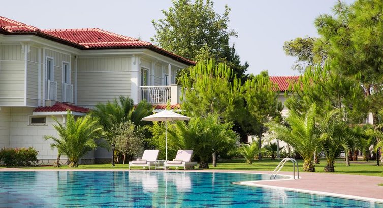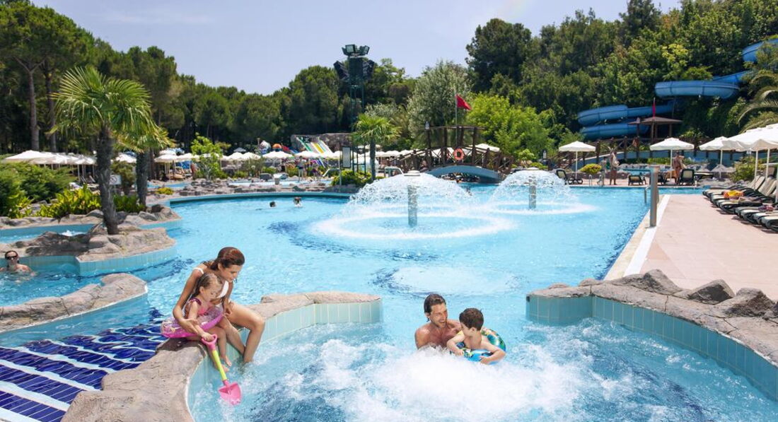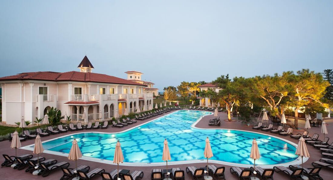 Весь отель очень зеленый, мини клуб утопает в соснах территория его больше среднего для такого отеля. Почти возле каждого домика есть бассейн можно просто выйти и попасть в почти личный бассейн. Есть открытый бассейн с подогревом и пару больших основных рядом с которыми проходят особые праздничные мероприятия.