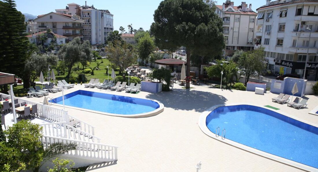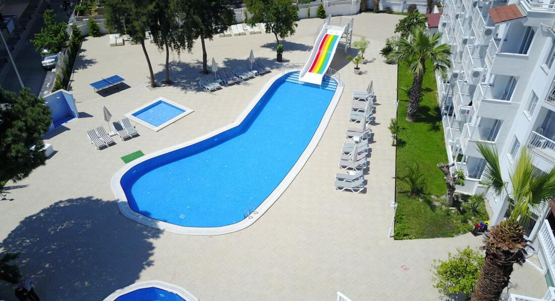 Плюсы -отличная для Мармариса территория, уютная, зеленая ухоженная. Расположение - до моря метров 200, но до нормального пляжа с лежаками и не самой мутной водой, советую пройти минут 10, например лежаки на пирсе при ресторане MOON (фото прикладываю). Покупаете напиток и лежите хоть весь день). Там очень здорово.