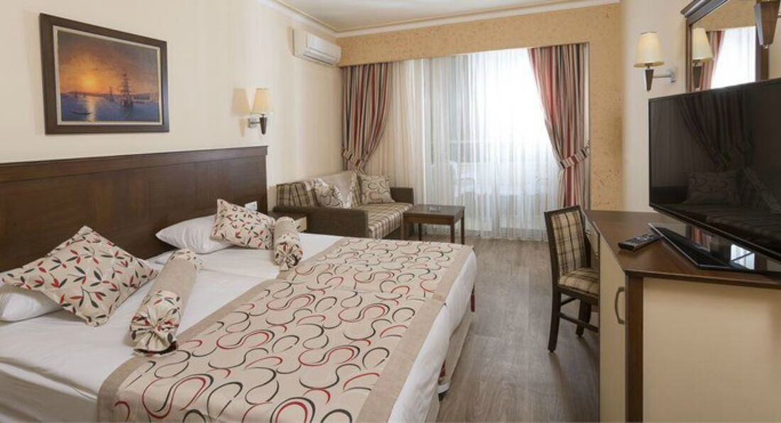 Хотелось бы написать отзыв, потому как сами перед поездкой искали отзывы об отеле. Ну не к чему было придраться. Номер был забронирован стандарт 2+1, так как были с мужем и сыном 4-х лет. Сначала нас поселили в дальний корпус, в двухкомнатный номер, но мы от него отказались, так как был сильный запах сырости. Вообще никаких проблем не возникло и нас переселили в отличный номер в одном из 3-х корпусов. Убирали, мыли полы и меняли полотенца ежедневно( в первый день положили 1$ и на этом все). Еда чудесная, персонал приветливый, ребёнка из бассейна вытащить не могли. И ещё, сначала заплатили туроператору деньги (по 20$ с чел) на поездку в хамам, но появился чудо-парень Назим и переманил нас в местный хамам. Подумали, что с ребёнком это будет проще, хоть и стоило это по 25$ с человека. И не пожалели ни на секунду. Никакого конвейера, были только мы втроём. Причём ребёнка обтирали, мазали, пенили и поливали наравне с нами. Когда нам делали массаж, он уснул. Неплохая анимация, деткам нравилась ежедневная дискотека. И ещё, хоть и находится отель не на самом пляже, но чудесный автобус возит туда и обратно каждые 10 минут. А если медленно прогуляться, то займёт это минут 5 от силы. Спасибо за чудесный отдых и довольную моську ребёнка, Hane Sun.