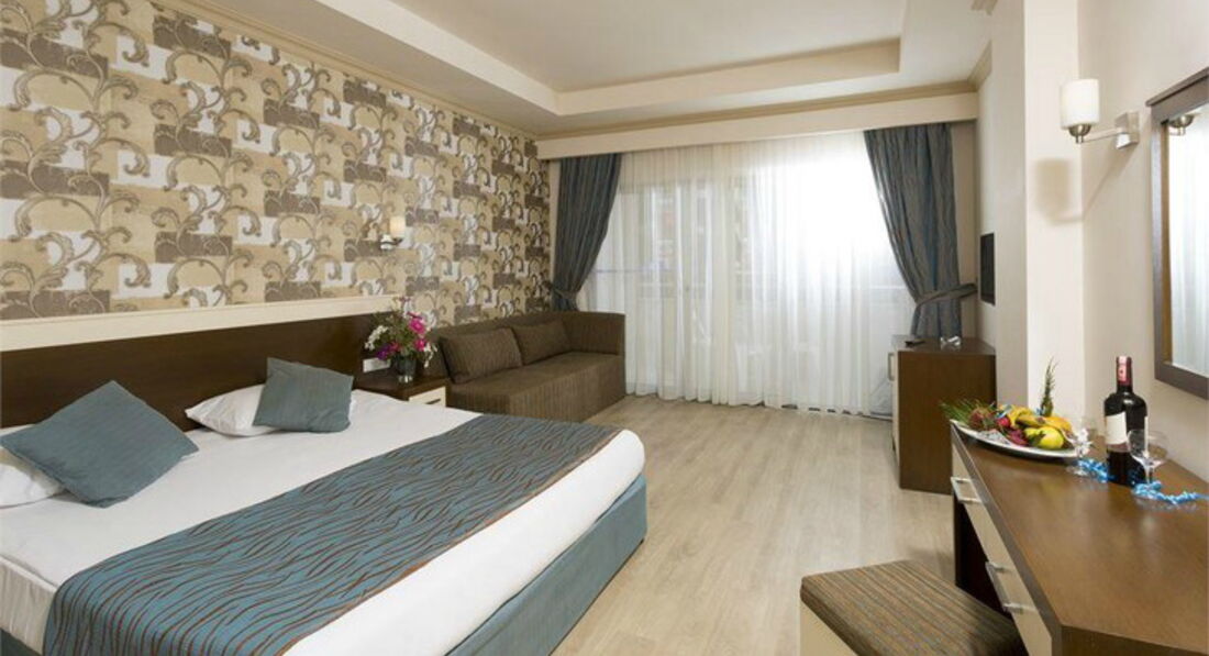 Я отдыхала с тетей, по приезду в отель сразу одели браслеты,проводили в номер,но как только зашли в номер были очень удивлены...Мы бронировали что бы в номере было две кровати, нам предоставили одну и возможности поменять номер нет (это был номер на 3 этаже- мансарда,номер 2501, балкон выходит на балкон соседнего корпуса).На следующий день нам предложили номер с двумя кроватями,но с одним маленьким окном.А потом про нас вовсе забыли...Это был не единственный минус,минус еще с анимацией,вечер начинался с 20:00 и до 22:30 с начало для деток дискотека,Юля молодечик проводила, а затем для взрослых,а потом всех желающих в 24:00 возили в Сидэ на дискотеку,а в этот период с 22:30 до 24:00 люди сидели у бассейна не расходились,включали музыку на телефонах. По обслуживающему персоналу не достатков нет, они большие молодцы. Кухня отличная, но по мне так маловато было рыбы. Официанты и бармэны очень любезные, общительные, воспитанные,опрятные. На пляж возил автобус каждые 10-15 минут,но мы ходили пешком это составляло минут 7-10. Отели присвоены 5 звезд,но пока они не дотягивают до пяти,но твердая 3 или 4-.