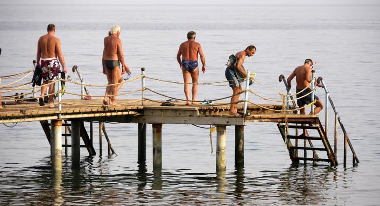 Пляж шикарен, мест хватает всем всегда. С полотенцами, за тобой несут матрас и кладут, где тебе надо. Верблюды и мухи на месте. Дети бедуинов более редко ходят, но есть. Пирс за это время реновировали, покрасили и прицепили резиновые коврики к ступеням, вместо веревочной обмотки. Если садитесь на ступени, то резина очень хорошо красит купальные костюмы. Дома все отстиралось, но там пришлось ходить "штампованным".