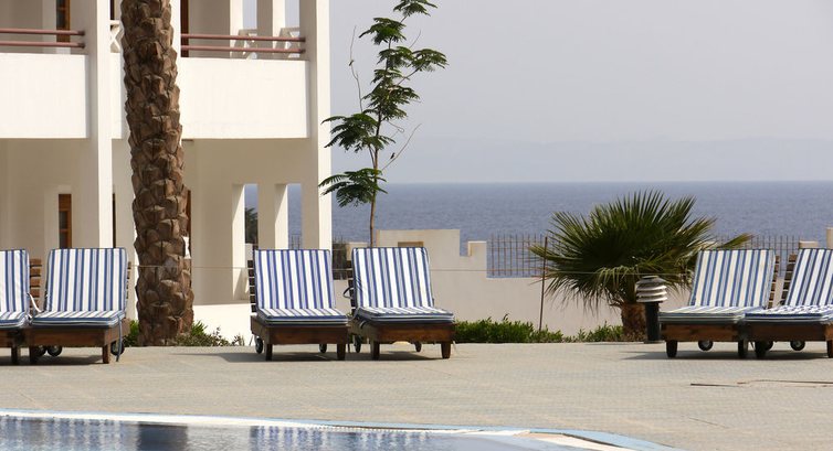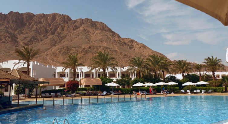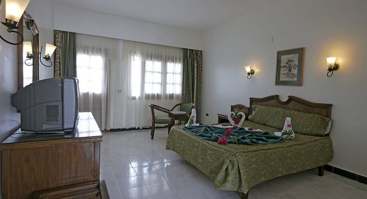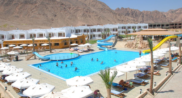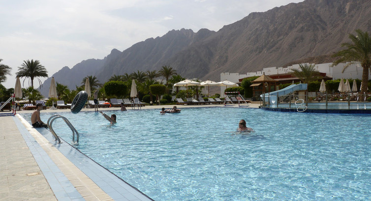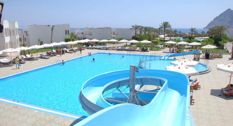 Отель с большой зеленой территорией, много бассейнов и две водные горки. Номерной фонд староват, мебель "уставшая". В номере есть сейф, кондиционер, холодильник, терраска или балкон. Номер стандарт 22м, убираются ежедневно. Еда достаточно разнообразная, фруктов мало. Пляж большой, по кромке которого переодически ходят верблюды и лошади, пологого входа нет, только с пантона.