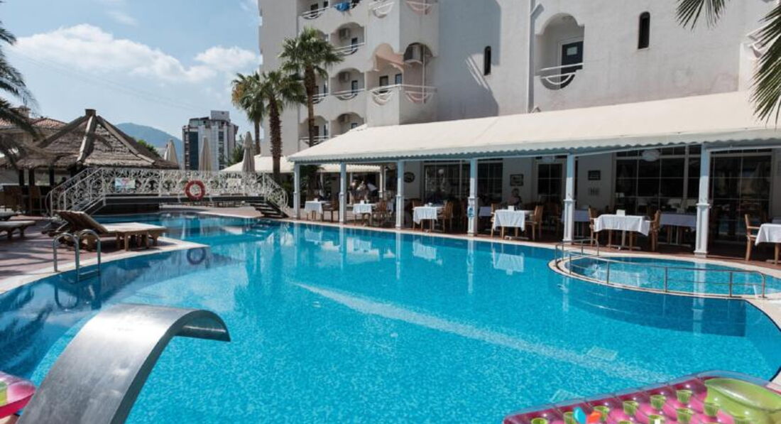 Начну рассказ по порядку. Ездили отдыхать мы большой и шумной компанией! Выбрали этот отель, от безысходности, так как приехала покупать путевки в другой отель, и в него мест уже не осталось! Стали читать отзывы... Общее мнение у всех сложилось что едем в ужасный отель...но мы настроились на самое худшее и с улыбками полетели в Мармарис! В нескольких отзывах, читали такую информацию, что отбирают алкоголь на ресепшене,мол нельзя со своими напитками в номер! Я не понимаю кто пишет такие отзывы,наверно люди которые ведут себя на отдыхе- "ТАГИЛ" , потому что у нас ни чего не забрали! Хоть мы алкоголь и попрятали в чемоданы,но из номера у нас ни чего не забирали! Личными глазами видела как на ресепшене ребята проносили из дютика алкоголь, и у них тоже ни чего не забирали! Нам наша Гид сказала, что отнимают алкоголь у тех,кто не пристойно себя ведет-вот и все! По поводу еды! Еда-просто изумительная! Так же повторюсь,плохие отзывы пишут видать гурманы и привиредливые! Еда всегда была разнообразной, вкусной, и свежей!!! Оценка+5! Сам отель хороший! С небольшой территорией и одним бассейном! Мы приходили купаться в бассейн часов в 5, когда было по-меньше народу, и купались там во все удовольствие! Бесились и прыгали! И ни кто нам ни чего не говорил! А то кто то написал в отзывах что нельзя прыгать в бассейне! Да,мест свободных мало на лежаках, но я не пойму, зачем ехать отдыхать на море, если весь отпуск провести валяясь у бассейна! Номера в отеле очень хорошие! С современной системой входа в номер! Вот единственный минус, и то не минус, а так, недочет, это карточная система напитков! Не особо удобно, но мы не парились! Персонал очень приветливый и дружелюбный! Молодежи не особо много, но я скажу такую вещь, что отдых вы сами себе устраиваете, и мы устроили себе замечательный отдых, веселились как могли, хотя повторюсь что настроились по отзывам на самое худшее! Так что дорогие товарищи, плохие отзывы по этому отелю писали люди, которым было очень скучно, и нужно было к чему то придраться! Вот и все! Отель действительный очень хороший, и идет на все 4+!!! Советую его всем! И веселым компашкам, и парочкам, и семьям! Относитесь по проще к отдыху, и вы заметите что отдых у вас выйдет просто отличным!!! Хотела бы вернуться еще раз в Мармарис и в этот отель!