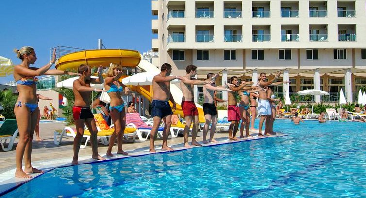 -на 5ый день прибывания в этом райском отеле увидели аниматора, проводящего аквааэробику. т.е. если Вы попали в эту дыру-не отчаивайтесь, может через денек-другой-третий будет Вам хоть какое то развлечение. но и радуйтесь не сильно, я бы так уныло не провел аэробику даже, но если Вы перед этим делом пропустили три-четыре кружечки пива-пойдёт наверн)