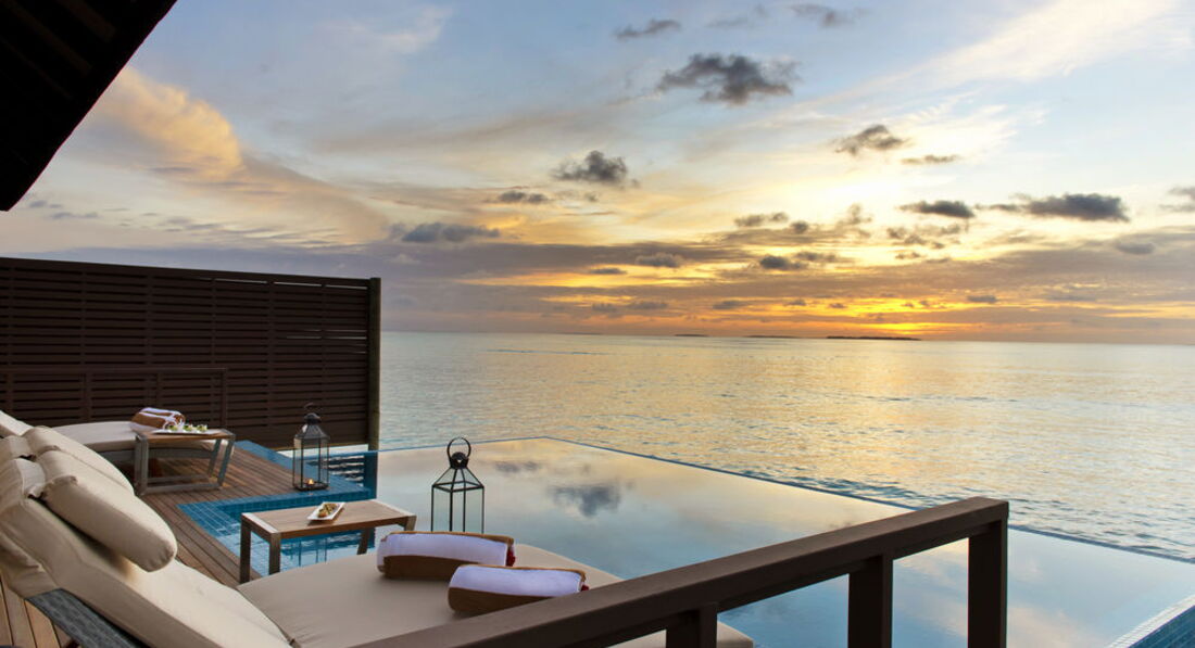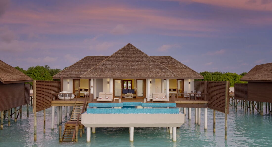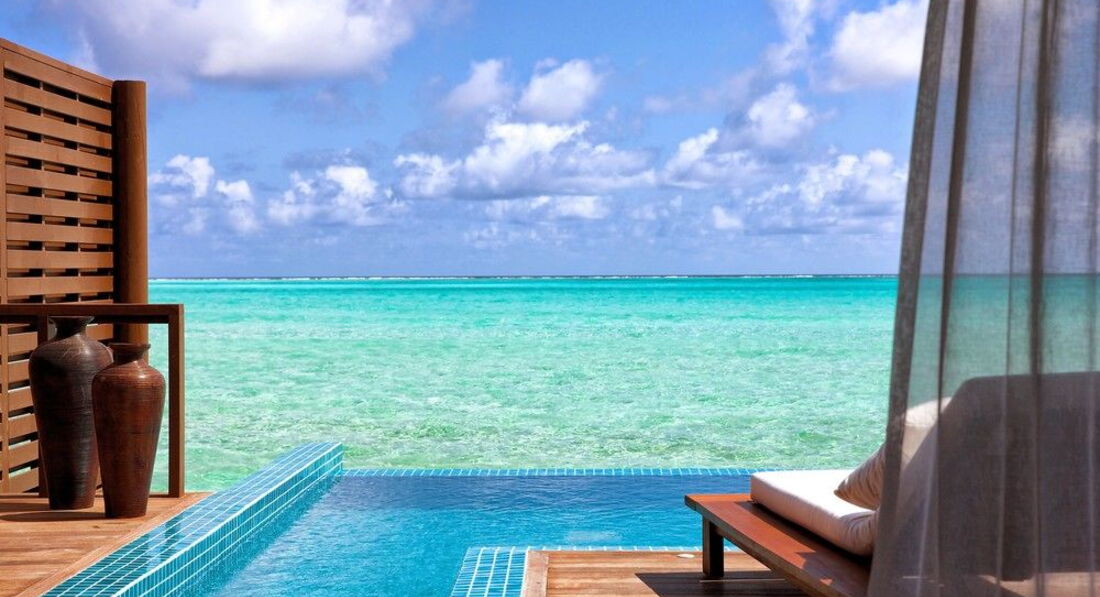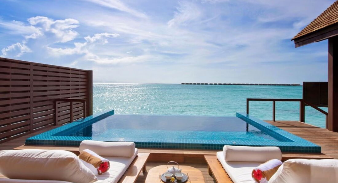 2 Ocean Suite with Pool (340 м², макс. - 4 або 2+2 чол.). Водні вілли. Дві спальні, дві ванні кімнати, вбиральні, вітальня з обідньою зоною, тераса, приватний басейн (25 м²).