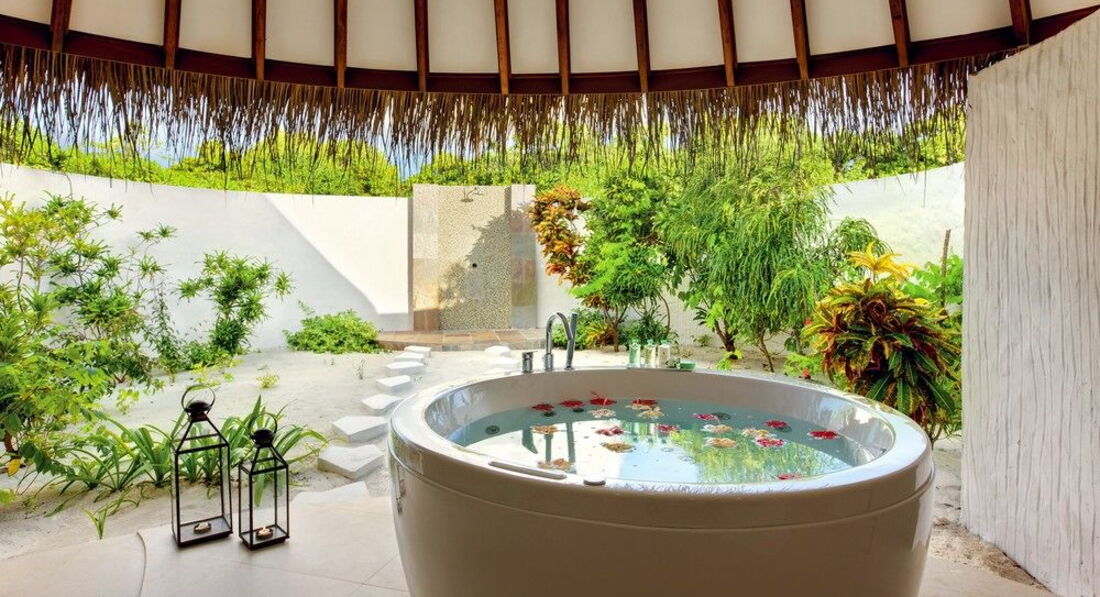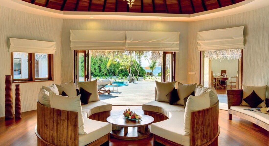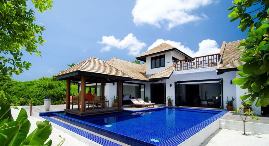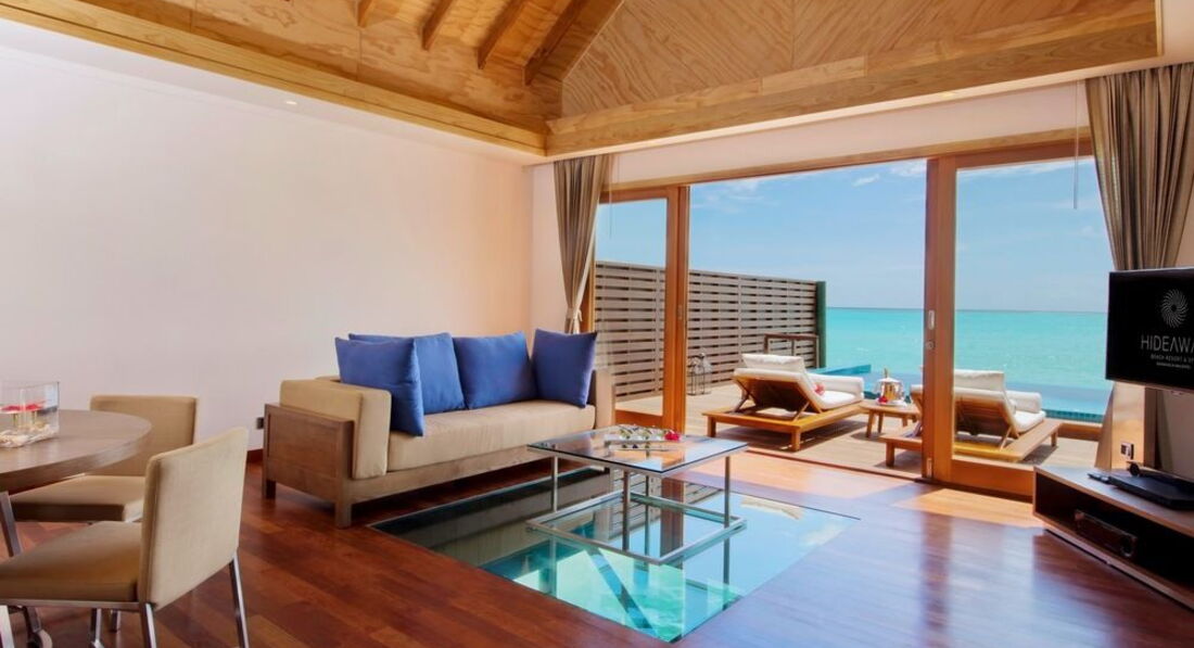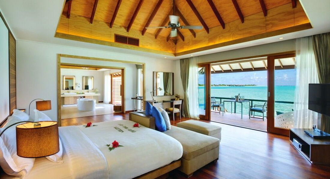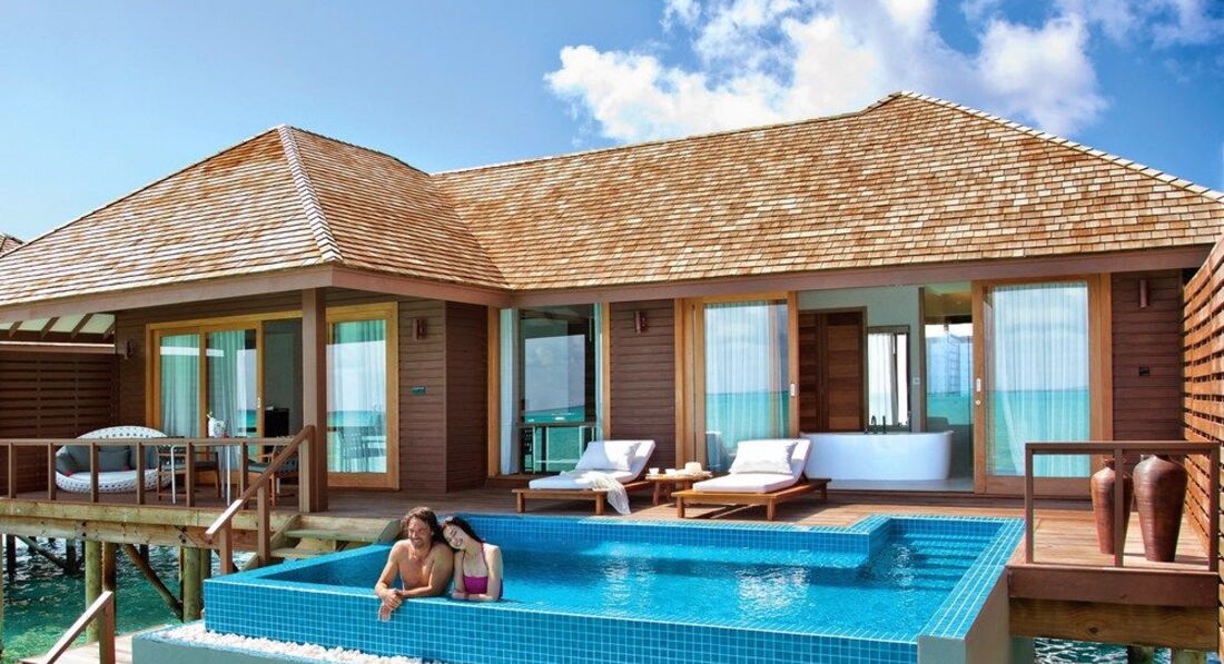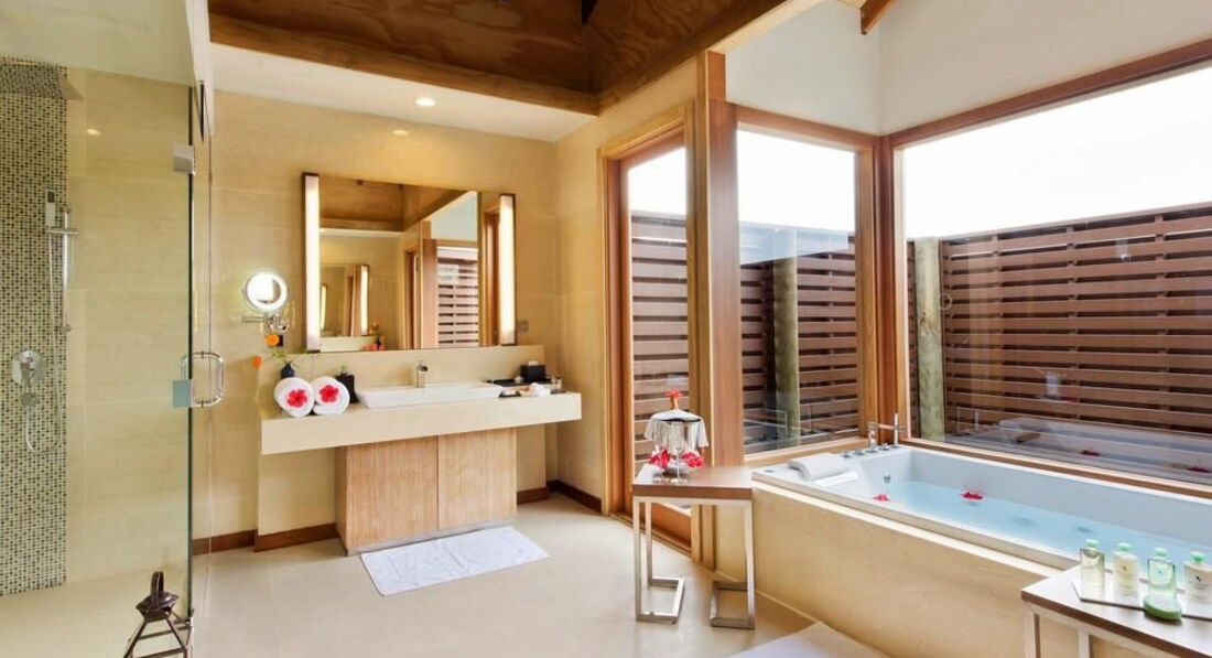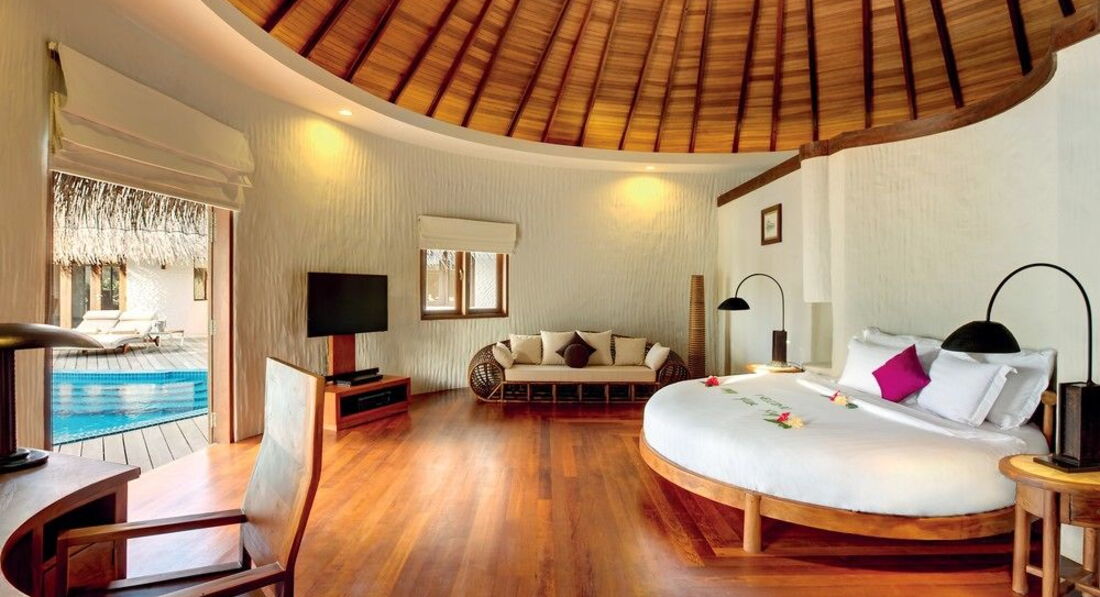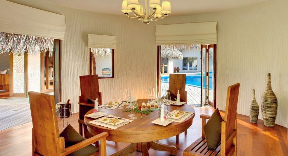 5 Ocean Villa with Pool (300 м², макс. – 3 або 2+1 чол.). Водні вілли розташовані на палях у водах лагуни. Спальня, вітальня зі скляною панеллю в підлозі та обідньою зоною. Ванна кімната з телевізором, джакузі, душ, дві раковини. Приватний басейн (22 м2) на терасі, прямий спуск у воду.