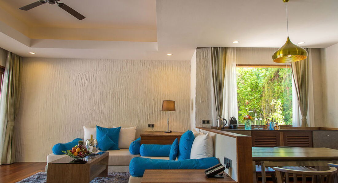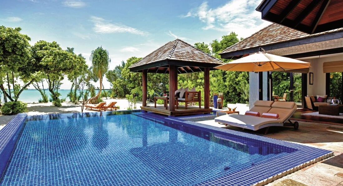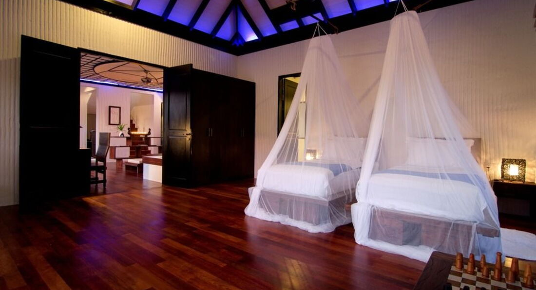 7 Family Villa with Pool (705 м², макс. - 3 або 2+2 чол.). Спальня, окрема вітальня, вбиральня, дві ванні кімнати (включаючи гостьову ванну з душем), ванна з функцією джакузі, два душі (відкритий та закритий). Тераса на даху з видом на лагуну, безкрайній басейн, зона вітальні на відкритому повітрі, приватний садок.