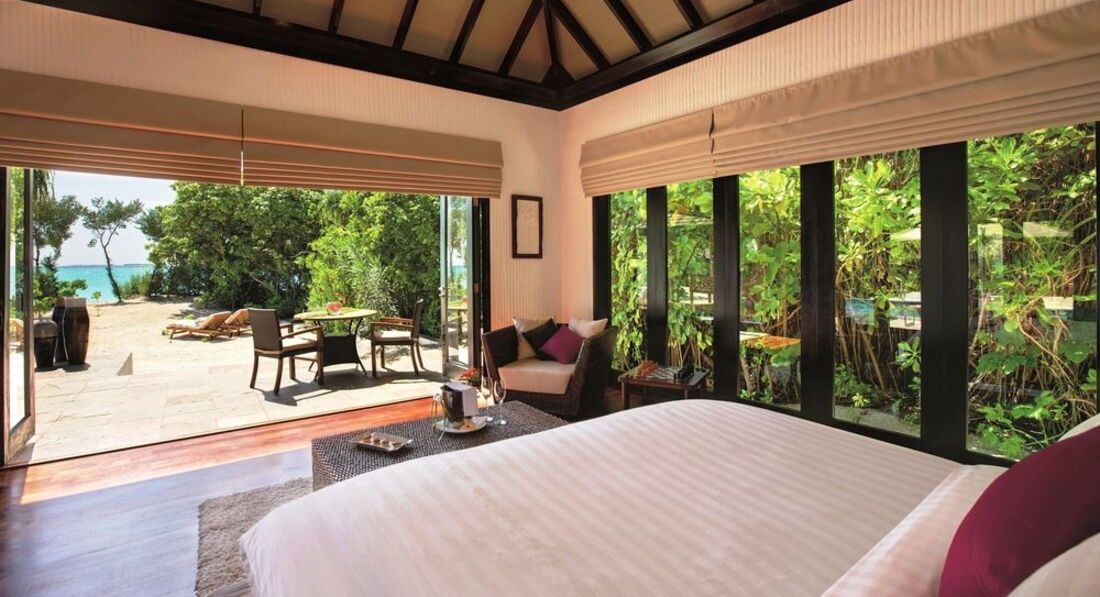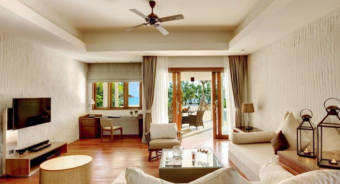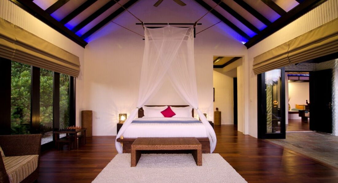 7 Sunset Beach Villa (176 м², макс. - 3 або 2+2 чол.). Просторі пляжні вілли. Спальня (підлога з дерева тика), окрема вітальня, вбиральня, ванна кімната частково на відкритому повітрі з джакузі, тераса з індивідуальним виходом на пляж.