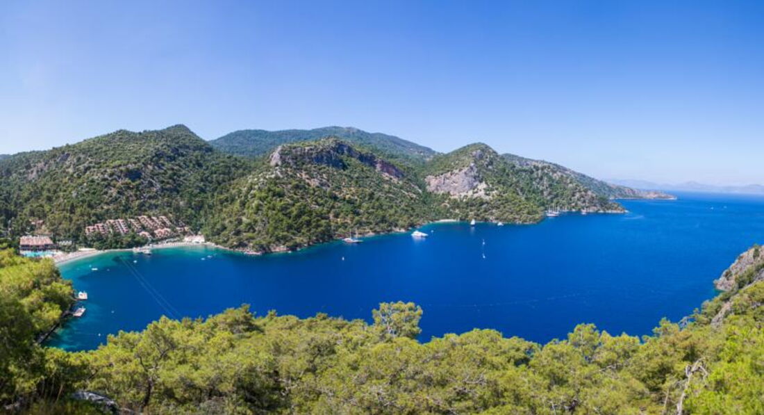 И так прилетели в аэропорт Даламана, был организован индивидуальный трансфер, расстояние до отеля около 30 км. Добрались быстро. Отель находится в собственной бухте. Расположен на горе, утопает в реликтовой зелени.