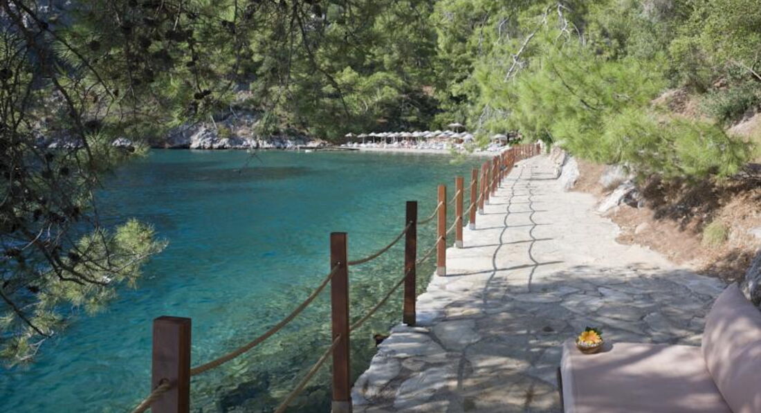 Шикарнейший отель!! Офигенный!!! Номера просто отпад!!!!!!!!! Большой, светлый, читенький!! Есть терасса!!!!! Большая, с диванчиком, столиком. Ванная комната очень клёвая! Есть инфракрасная лампа (если вдруг прохладно, когда вышли из душа, включаете и вам тепло). Душ и туалет за стеклянными матовыми дверьми. Куча просто ванных пренадлежностей! Шампуни, бальзамы, гель для душа, лосьон для тела, резинки для волос, бальзам для губ,зубные щётки, зубные пасты, жидкость для полоскания рта, мочалки и т.д. В номере большая гардеробная, с зеркалами. Территория здоровенная!!! По территории можно ездить на тук-туке, так же есть фуникулёры. Бассейны класнные! Вокруг сосны! Горы! Красота! Легко дышытся!! Пляж супер! (мелкая галька). Вода на столько бирюзовая, что "утопаешь" в этой красоте!!!!!!!!!!