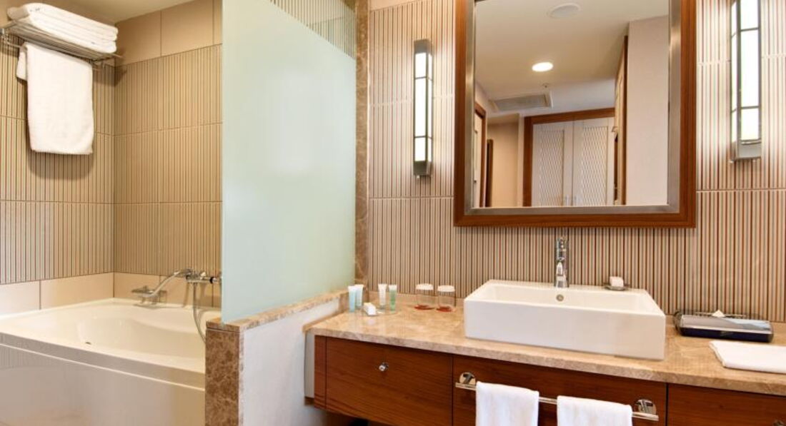 Посмотрев все варианты, прикинув, чем мы будем пользоваться, а чем нет и оценив стоимость, как раньше писал, мы остановились на номере DELUXE ROOM, как и был. В номере отличная ванная, душ, удачная зона у раковин, большая комната (мы в итоге выкинули маленькую детскую кроватку и поставили две дополнительных кровати) в которой разместились двуспальная (огромная) кровать и две дополнительных и при этом, не чувствовалось тесно. В отеле великолепная шумоизоляция, я такой не встречал ни разу в отелях. Ни каких проблем с уборкой не было (единственное, при заселении нужно чётко прописать время уборки удобное для Вас, иначе номер будут убирать по остаточному принципу – вначале с фиксированным временем уборки, затем номера под заселение, а потом остальные). Полотенца, сколько попросите, столько и будут носить, хоть по три на человека. Так же нет ни каких проблем и заморочек с пляжными.