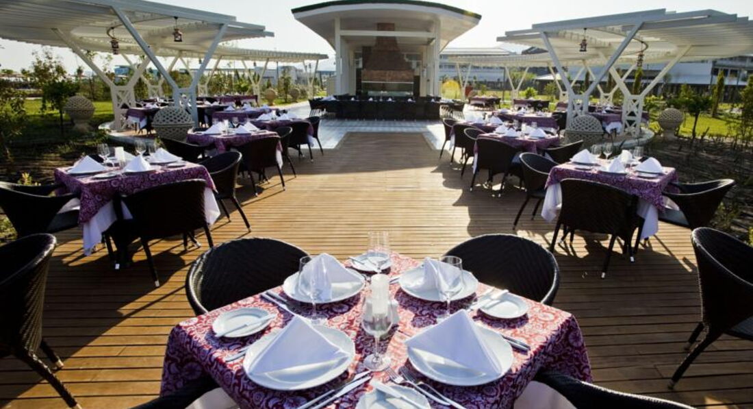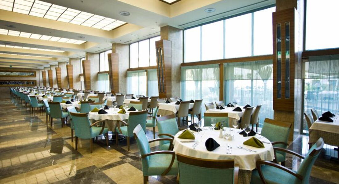 Про ресторан (так получилось, что мы за 16 дней ни разу не сходили ни в один из А-ля карт ресторанов или расположенные по территории кафе) и питание только положительные отзывы. Всё на высшем уровне, вкусно и красиво. Опять же все респектабельно, если можно так сказать о ресторанах самообслуживания. В любое время нет толчеи, всегда полные подносы и емкости с едой, ничего не нужно ждать или за чем то охотиться. Есть зона для пар без детей, диетический стол и т.п. В отеле нет повторения меню ни по дням, ни неделям, каждый раз составляют новое меню. Из-за этого нет ощущения однообразия и «столовки». Утром есть фреш сок. Подают очень приличное вино и пиво, а для желающих великолепная платная винная карта. Еда вся с изюминкой, достойная для ресторанов А-ля карт. Очень много различной рыбы, а вот морепродуктов – наоборот. Что удивительно для Турции – вкусные арбузы и дыни. Наелись до отвала свежим инжиром, он был аж двух видов! Отличный Шеф и вышколенный персонал. И как результат – ни разу не возникло желание сходить в А-ля карт (и не по причине маленьких детей)! Кстати постоянно (мы всё время ходили ранними пташками из-за детей, и утром и вечером) работала местная СЭС, брала пробы со всех продуктов.