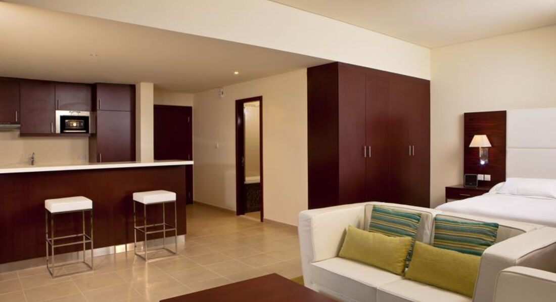 Возможно , мой отзыв будет полезен для отдыхающих с малышами. Отдыхали мы с мужем и ребенком 1,3 года неделю в зимние каникулы в резиденции. скажу о плюсах именно резиденции-тихо, спокойно , в ресторан на завтрак и ужин нет очереди и давки, как пишут о Ресорте. номер был на 8 этаже с видом на море-стройку. Полагаю ниже селиться не стоит будет слышно стройку и дорогу. Зато во второй половине дня было солнце-зимой это было как раз кстати. номер был без кухни. Сначала переживала, но муж убедил, что я приехала отдыхать от плиты. тем более студия с кухней оказалась по площади меньше (мне ее предложили на 1 этаже), поэтому все к лучшему и мы остались в своем номере. Питание завтрак и ужин шведский стол- довольно диетический , для ребенка овсяная каша, творог, яйца, различные йогурты и фрукты мы находили. По сравнению со скудностью итальянского завтрака- здесь просто рай. отдельное спасибо повару за мясные блюда на ужин- всегда были отменные, рыба на выбор жареная или на пару-это было приятно. Супчики на ужин были похожие на наши :борщ, куриный, овощной. Отдельное слово о выпечке- отличного качества: от круасанов и кексов на завтрак, до итальянских тортов на ужин... Прощай фигура! один раз заменили ужин на обед- по меню. на наш вкус очень острые блюда-арабские, детям кроме макарон есть не чего. Нам не понравилось. Обедали обычно в кафе у моря-благо ребенок после купания спал в коляске и давал возможность отдохнуть. Кухня вполне сносная. другие рестораны не посетили- сын непоседа не дал бы возможность насладиться кухней и музыкой, поэтому ужин шведский стол нам был в самый раз.