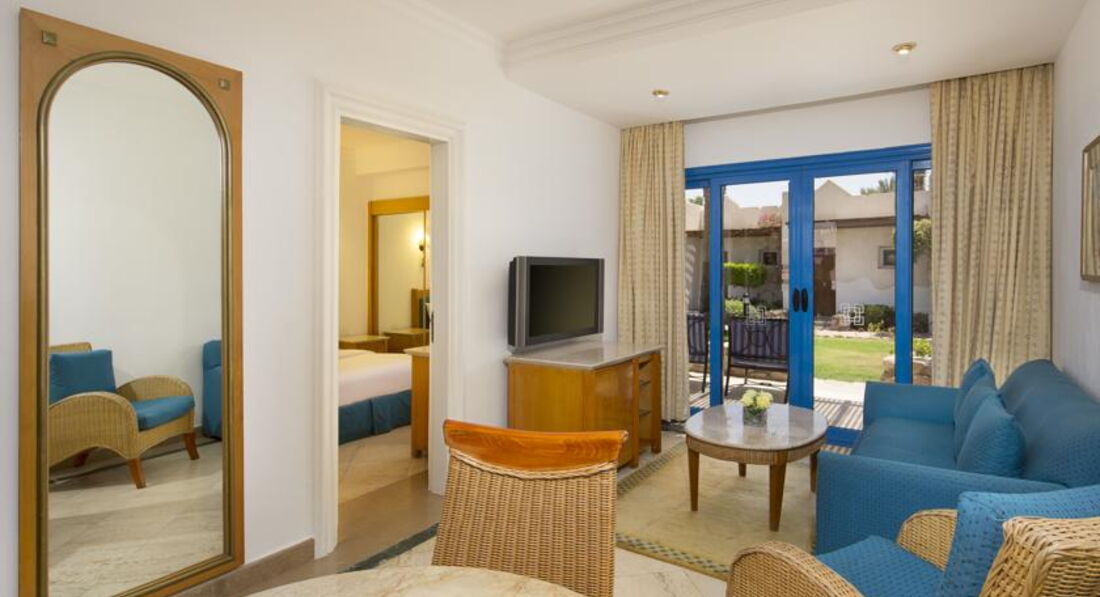 Junior Suite (розташовані в бунгало, garden view, макс. 2+2 чол., спальня (з дверима), вітальня, ванна, тераса, 30 м2),