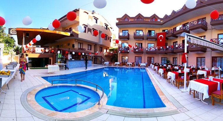 Тройка в которой мало что хорошего!Отель маленький на 2ой линии, но до своего пляжа идти еще минут 15 вправо от отеля. Еда- даже не тройка. Мне хватало а вот муж ныл и клялся ни за что в Турцию больше не поедет. Поэтому ходили кушать на арбат. Номера страшненькие. Бассейн который не внушал доверия- не тянуло охладиться. Неподалеку 3 дискотеки- так себе. Пляж полностью из камней- нужна обувь. Положение спасали только экскурсии. Персонал дружелюбный. Особо минусов я не ищу никогда в плане тараканов, плесень под плинтусами и проч. , мы стараемся в любом месте получать удовольствие от отдыха, но туда я точно больше не хочу. Вобщем если есть возможность выбирайте другой отель) Ну или если вы на экскурсии погонять отправляетесь, то выспаться можно и в таком.