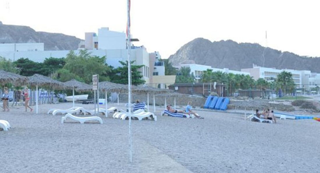 Территория засажена финиковыми пальмами, кустарником и деревьями, которые постоянно поливают. Посередине мотеля находится средних размеров бассейн, в котором мы не купались, т.к. очень много хлорки, окружен одноэтажными зданиями: ночной клуб, кофейня, минимаркет (все для пляжа), кабинки для переодевания и душевые. Ближе к пляжу находится кафе «Океан», которое при нас ни разу не работало. Местные предпочитают вечерами проводить время, как ни странно, около бассейна. В море по выходным приходят стайки арабских детишек, да и то посидеть в одежде на полосе прибоя. Наверное, боятся или не умеют плавать.