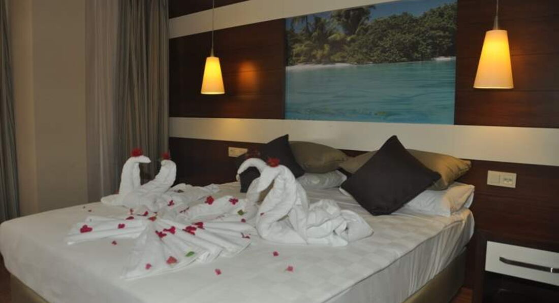 Отдыхали с молодым человеком в мае 2015 года! Фотографии отеля , номеров полностью соответствуют действительности, это очень обрадовало! Отель чистый , новенький, номера прекрасные, чистые современные! Заселили нас в течении 3х минут , так как у нас стояла пометка , что мы молодожены, номер был весь украшен цветами и лебедями из полотенец! Так же вечером в номер принесли тарелку фруктов и бутылку красного вина в специальном ведре со льдом) убирались в номерах каждый день,через день меняли полотенца! Питание в отеле нам очень понравилось, рыба , мясо и курица каждый день, так же Кольмаре во фритюре и креветки и много чего другого! Голодным точно не останешься !!! Много сладостней и фруктов, яблоки апельсины арбузы клубника! У отеля нет пляжа, есть пляж с платными лежаками! Но мы загорали на песке и не парились! До моря пешком не спеша 5 минут! Либо каждые 10 минут ездит специальный трансфер от другого отеля , но он берет всех кто желает ! Море и пляжи чистые! Отель расположен в городе поэтому по вечерам можно гулять, как и по центральной улице , так и по набережной! Она нереально длинная, вечером там куча кафе и развлечений ! Так как в отеле нет вообще анимации , мы гуляли каждый день! По набережной можно дойти до античного города и полазить по развалинам, там очень красиво! Только амфитеатр платный 15 лир на человека! Но это стоит того! Так же в отеле есть wifi бесплатный! Так как Сиде это евро зона там все в евро, но принимают и доллоры и Лиры и рубли! Русских туристов там мало, в основном немцы! Но нам это даде нравилось! Так же в отеле есть бассейн и небольшая горка! Бассейн охлаждают ! В общем для нас эта 4ка показалась очень даже достойной! При отеле есть клуб , гостям отеля вход бесплатный! Самый лучший крут в Сиде! Рядом с отелем есть свой базар!