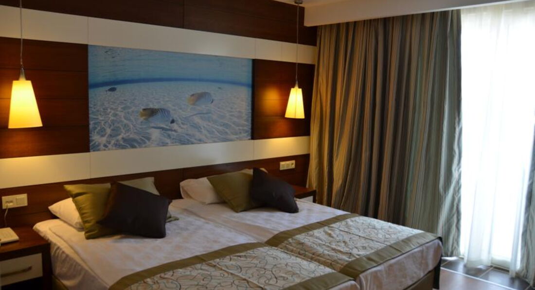 Отдыхала в июле 11дней, заселили в номер на 4 этаж с видом на городскую улицу с торговыми рядами , менять не стала, номер отличный, чистый, мебель новая, постельное белье всегда чистое и не потрепанное. Номера убирались каждый день, очень чисто, даже без чаевых горничные крутили красивых лебедей. Полотенца менялись если бросите их на пол.Нашла еще один плюс, так как номер находился над рецепшен, почти всегда был wi-fi. Территория отеля очень маленькая, до моря идти примерно 5 минут, пляж песчаный, вход удобный, по утрам по нему ходит очень много немцев, занимающихся спортивной ходьбой,что рекомендую делать всем, иначе наберете однозначно лишние килограммы, потому что кормят в этом отеле очень вкусно и разнообразно, и очень сложно отказать себе в чем либо, пиво и крепкие напитки без ограничения всегда были в наличии. Причем очередей в ресторане практически не бывает. Обслуживающий персонал дружелюбен, внимательный к просьбам. В отеле отдыхает много немцев, были поляки, русских немного, совет-повторите и вспомните самые распространенные фразы и просьбы на английском или немецком языках, так как не весь персонал понимает русский. Анимации в отеле не было, взрослые себе развлечения всегда найдут, а вот детям было очень скучно, родители жаловались, что с детьми в этот отель больше не поедут. Дети днем были предоставлены сами себе и одной водяной горке. Общее впечатление об отеле осталось хорошее, отель спокойный, море рядом, пляж отличный, кормят вкусно. Не рекомендую для семей с детьми.