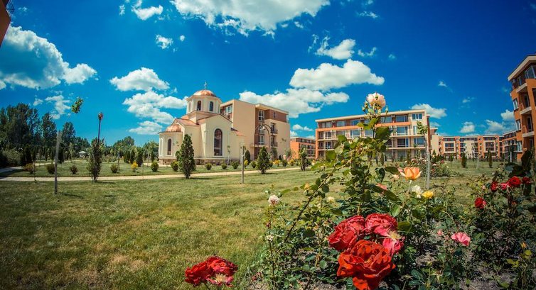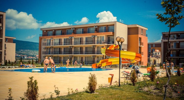 Отель расположен достаточно далеко от центра и в 40 минутах ходьбы от пляжа, что вероятно, не понравится молодежи, но идеально подойдет ценителям спокойного отдыха. После трансфера на автобусе, когда было развезено с десяток туристов мы с подругой совсем было отчаялись от вида и месторасположения тех отелей, куда заезжал наш автобус. Отели располагались в городе, не имели собственной территории и выходили прямо на пешеходную дорожку, а то и прямо на проезжую часть. Бассейны отелей тоже размещались на виду у прохожих. Однако, наш отель все еще не был виден. наконец, мы остались в отеле одни и нас повезли на окраину города. Первое, что мы увидели, когда подъехали к отелю - это громадная охраняемая территория, с зелеными газонами, тротуарчиками, обсаженными кустами роз. На территории несколько комплексов домов с апартаментами, 6 бассейнов, включая охраняемый детский с классной горкой (на которой, собственно и торчали наши дети). Вход в отель по магнитной карте, стоит она 20 лев (500 руб) деньги вернут при выезде. Нас поселили в корпус D3, на третьем этаже. У нас были двухкомнатные апартаменты. Спальня с двухспальной кроватью, шкафом, комодом. В гостиной размещался диван, столик журнальный и телевизор. Так же имеется кухня с электрической плитой, кофеваркой, микроволновкой, тостером, холодильником. Есть посуда. Тряпочек и Фери нет. В туалете - фен, вода есть всегда, в т.ч. горячая (бойлер). Апартаменты оснащены домофоном. Имеется ведро для пола, тазик для стирки. В обеих комнатах кондиционер. Вид из окна на бассейн и поле для гольфа. В общем, рай для тех, у кого есть детки. Можно спокойно отпустить гулять, на территорию чужих не пускают. Есть качели, тренажеры, массаж и т.д. Рядом с комплексом недорогой супермаркет ММ, покупали там продукты, через дорогу от комплекса - аквапарк. Пляж далеко. В 15 минутах ходьбы автобусы до Несебера. Красивый старинный город. Из сувениров - розовое варенье, наборы кремов с болгарской розой, Ракия, ну и магнитики-колокольчики, а так же лукум. Отель брали без питания, но программа требует оценки, так что просто поставила 5.