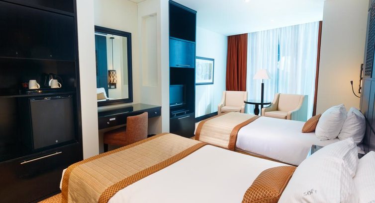 • ванна або душ • кондиціонер • фен • халат • телефон • сейф • супутникове ТВ • Набори для приготування чаю/кави • міні-бар • доступ в Інтернет • чайник • сервіс у номер • прибирання номеру • зміна постільної білизни Територія та послуги: • конференц зал • хімчистка • пральня • обмін валюти • Wi-Fi • перукарня • салон краси • сейф на ресепшен Розваги та спорт: • тренажерний зал • SPA-центр • сауна • анімація Живлення: Готель пропонує харчування за системою "сніданки". • 9 ресторанів (Інтернаціональна, тайська, індійська, арабська кухні та ін.). • спорт-бар • суші бар • лобі-бар Пляж: Готель не має свого пляжу. Пропонується трансфер на громадський пляж Kite beach 2 рази на день. Шезлонги, парасольки, рушники не надаються.