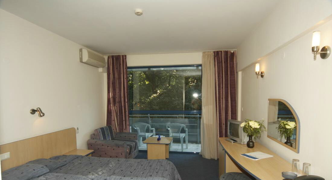 Вполне приличный отель. Заселилась 11 сентября, выехала 22. Сразу на ресепшене встретили дружелюбно, никаких денег не просили, не вымогали, как в Турции, очень скромные молодые ребята. Поселили на 4 этаже с видом на море и другой отель. Зелено. Номера просторные, чистые, может белье и не новое, но мне меняли каждый день. Уборка на уровне. Не жалейте чаевых, люди! Всего 2 лева (около 75 руб.) и вам хорошо и им хорошо. До моря далековато, но я ходила на пляж Ривьеры, через КПП, один раз амбал остановил и запросил 30 лев за вход, я обошла, но опять туда же пришла. Потом опять ходила на Ривьеру, мне надо, я иду. Больше не просили, уже не связывались. На этом пляже много свободных зон, пляж чистый и красивый. Все в зелени. На общем пляже грязь, не наступить, окурки и т.п. Питание: завтраки нормальные, блины вкусные, мороженое хорошее, плохо, что на ужин нет ни чая, ни кофе. Это очень не по-русски.