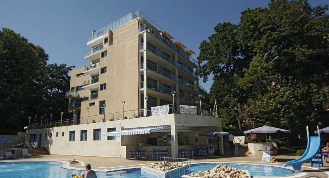 Недорогой, с хорошим обслуживанием и удачным расположением отель. Находится в достаточно тихом и спокойном месте, не новый, но в достаточно хорошем состоянии. Мы отдыхали в начале июня с сестрой. Покупали путёвки через туроператора ТПГ. Организован отдых отлично, долетели с комфортом, к отелю трансфер, полное информационное сопровождение. Встретили приветливые сотрудники рецепции, быстро заселили в номер. Номер небольшой, но уютный. Кровать, шкаф, стол, стул, зеркало. Есть кондиционер, тв, чайник. Балкон с пластиковой мебелью. Ванная комната с набором косметических принадлежностей, которые регулярно пополняли. Уборка ежедневная, смена постельного белья раз в 3*4 дня, но нужно напоминать об этом на рецепции. Персонал в отеле дружелюбны, можно легко решить любой вопрос. Питание нормальное, достаточно разнообразное. На завтрак готовят яичницу и омлет, жарят блинчики, есть нарезка сырная и мясная, оливки, фрукты, овощи, мясные блюда и прочее. На обед и ужин вкусные супы, гарниры, рыба, мясные блюда, салаты, овощи, сладости, десерты.На территории отеля есть небольшой бассейн с баром и лежаками. Пляж в минутах 5-7 от отеля. Нам больше понравился тот, что возле отеля Riviera. До центра всего пять минут. Развлечений и ресторанов полно, есть на любой вкус и кошелёк. От туроператора мы покупали одну экскурсию - в Несерб. Отдых получился замечательным, полноценно насладились пляжем, природой и гостеприимством Болгарии. Очень советую это место для отдыха.